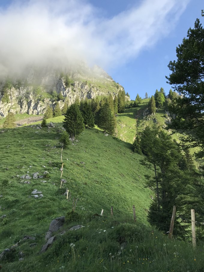 Um 6 Uhr kam ich mit dem Auto auf der Haggenegg an, fuhr mit dem Bike auf der Forststrasse bis zum Wanderweg und ging dann zu Fuss zur Alp Zwyschetmythen. Dort geht genau zwischen Stall und Alphütte ein Forstweg bis zu Rämsisiten. Am Ende des Weges ging ich über eine Steile Wiese und dann über die Geröllhalde unter dem Kleinen Mythen bis zu einem Sattel auf 1'586m. Von dort geht ein Wanderweg 100 m nach unten und unter den Felsen des Kleinen Mythen bis zum Griggeli, dem Sattel zwischen Haggenspitz und Kleinem Mythen auf 1'668 m.