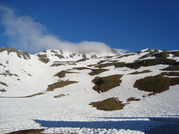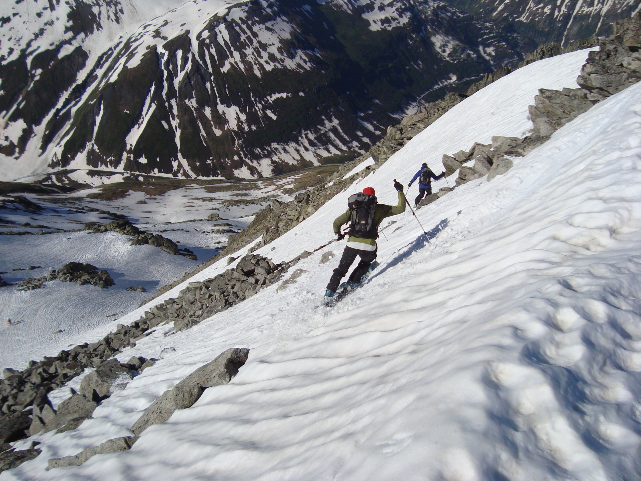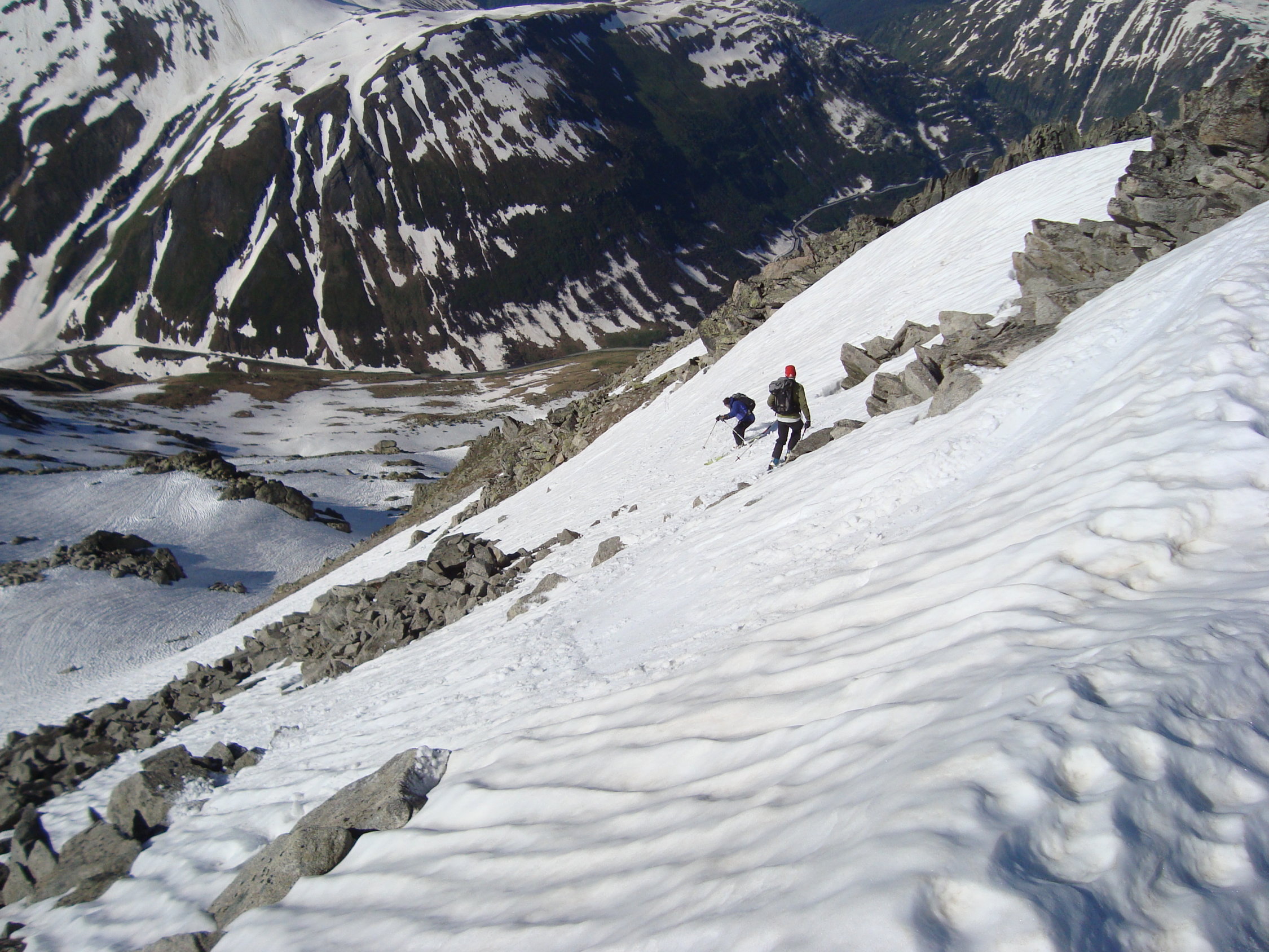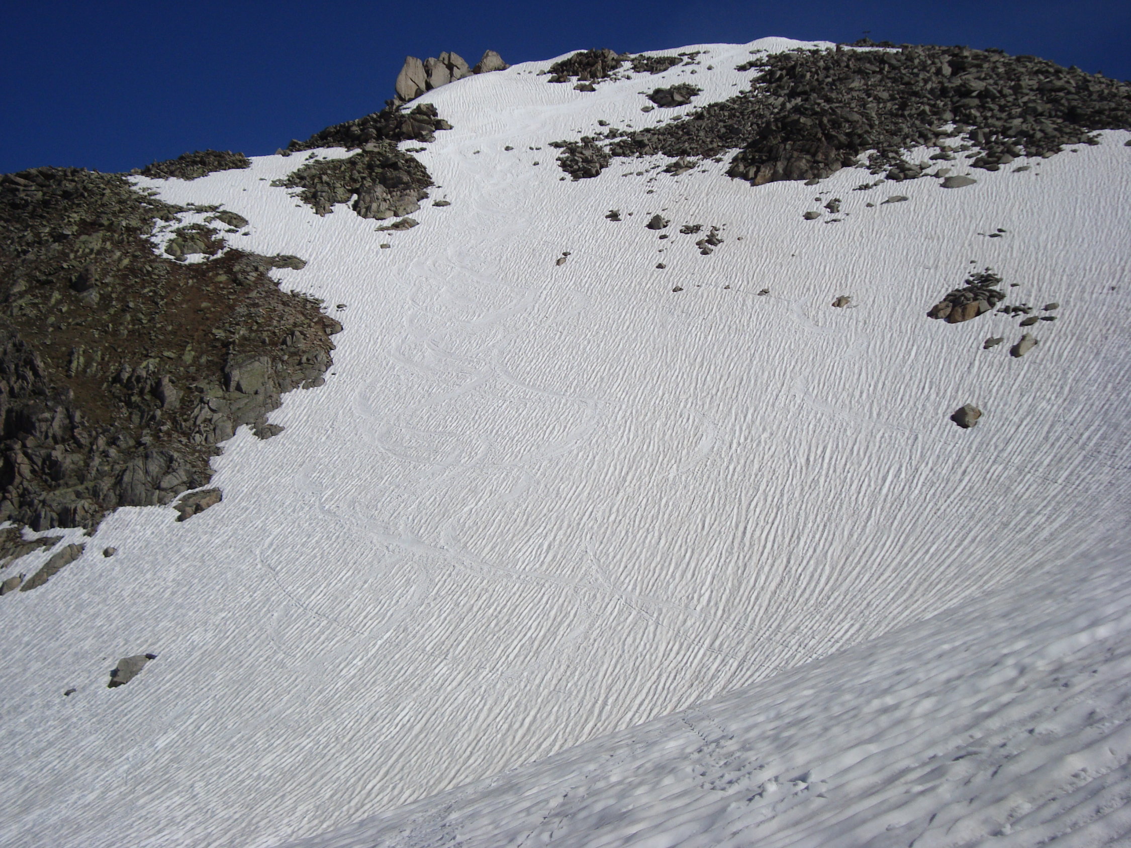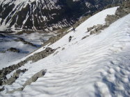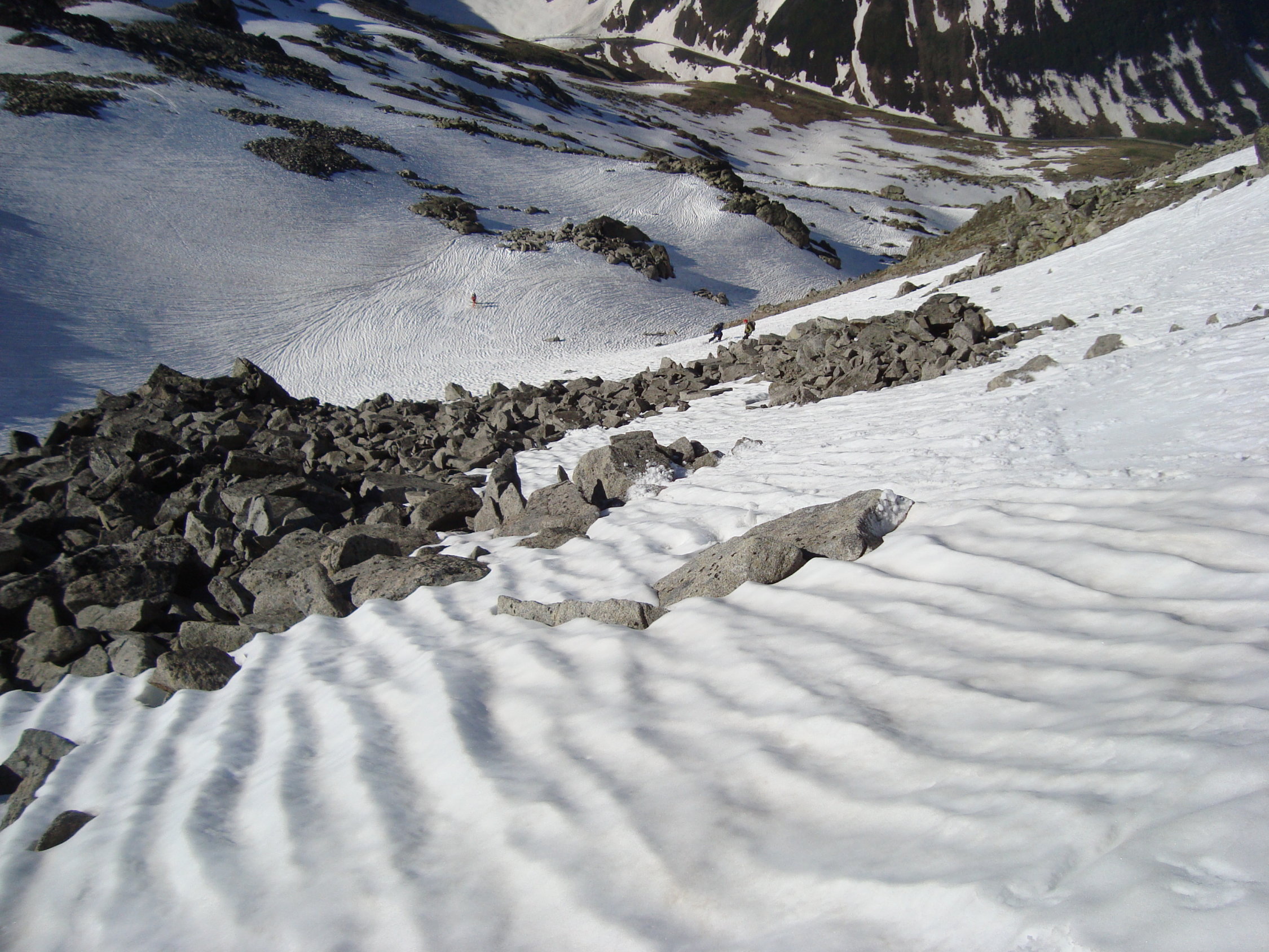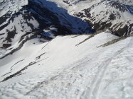 Die Einfahrt verlangte etwas mehr Konzentration, da die steile Flanke schon mit einigen Steinen gespickt ist. Ein Sturz macht hier üble Platz- und Schürfwunden! Mit Umspringen und Kurzschwingen ist dieser Variante jedoch gut beizukommen. Die Einfahrt selbst war relativ weich aber noch griffig, weiter unten bis zur grossen Mulde, etwas fester. Schön zu fahren. Ab der Mulde bis zur Ebene feucht (tiefer Sulz), doch alles war sehr gut drehend und kaum bremsend. Einzig das Dellenpanorama unter den Skiern, beanspruchte die "Stossdämpfer" ordentlich. Tipp: Einfach laufen lassen und an etwas Schönes denken. Nein, war ein Scherz;-).