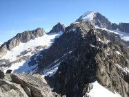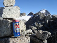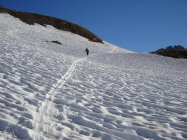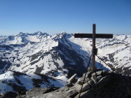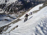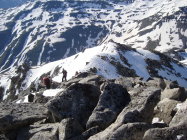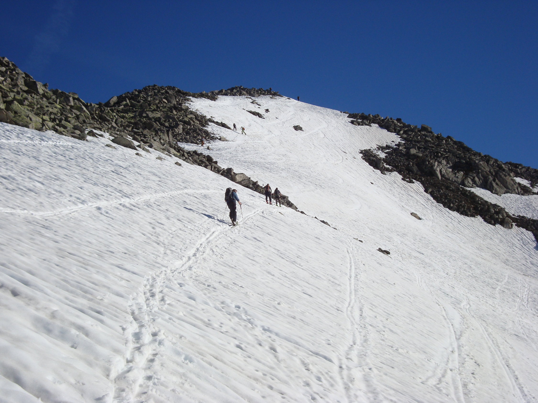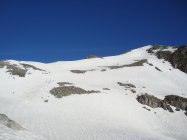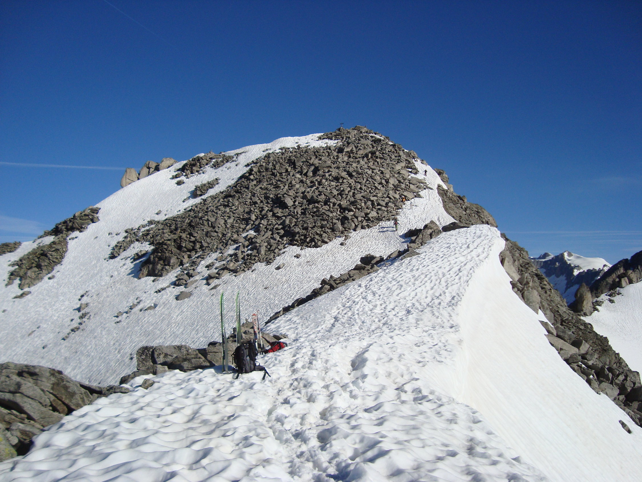 Man kann, wenn man will, bis zum Blockgelände(ca.3000M.ü.M.) kurz unterhalb des Gipfels mit den Ski gehen. Nur an einer Stelle am Gratbeginn, müssen die Ski für ca. 5m abgezogen werden. Jedoch ist das Skidepot,je nach persönlichem Ermessen, variabel. Ich nahm meine Ski, wie ein paar andere Tourler mit auf den Gipfel, um direkt südwestseitig die kurze steile Gipfelflanke abfahren zu können.