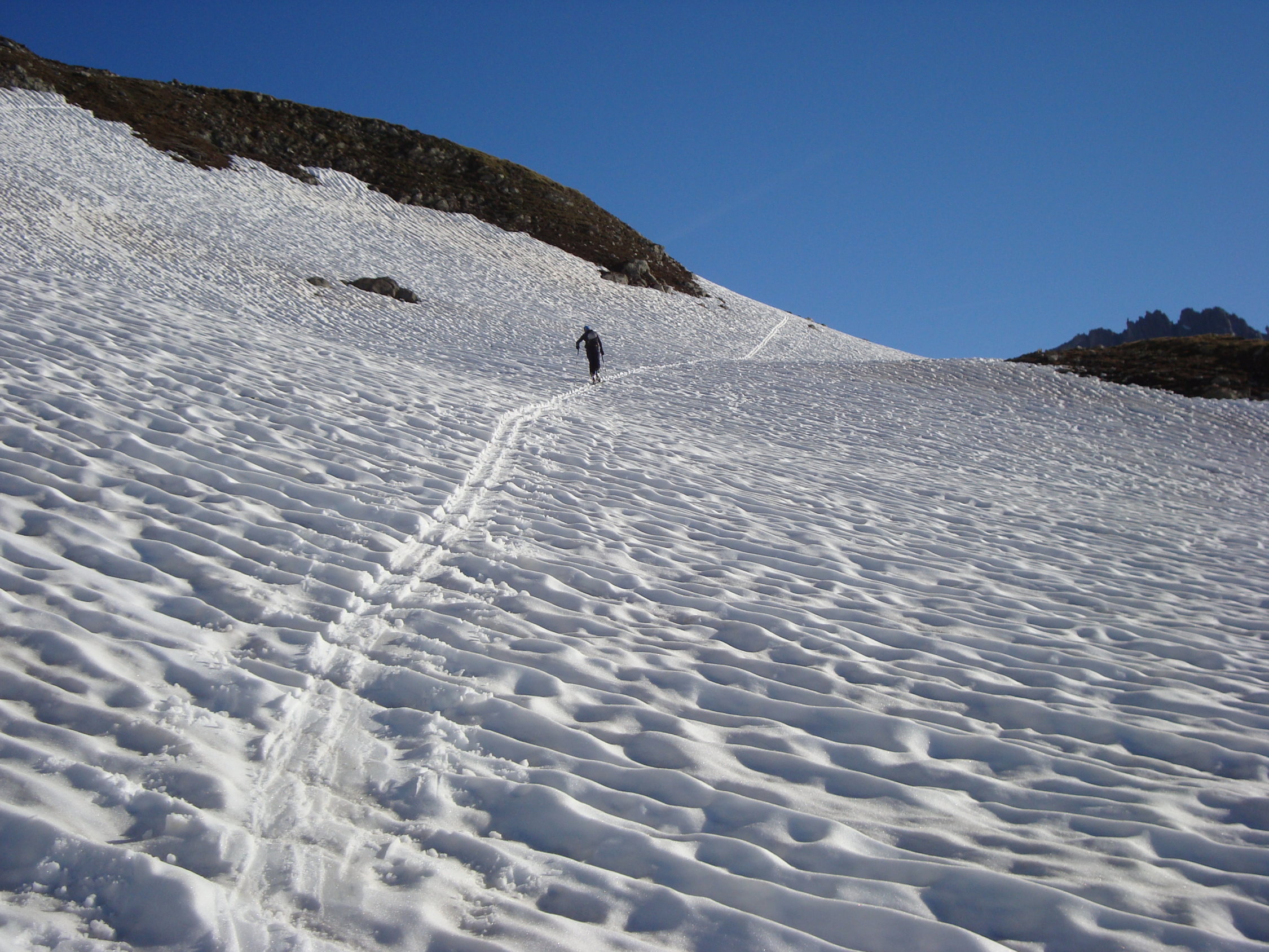 Der Schnee war im Aufstieg feuchtsulzig und die ersten 200hm bis zum Geländerücken vor der grossen Mulde, seeehr wellig. Alles in allem war die Schneedecke aber gut tragend und relativ griffig zum steigen. Harscheisen habe ich keine benötigt.