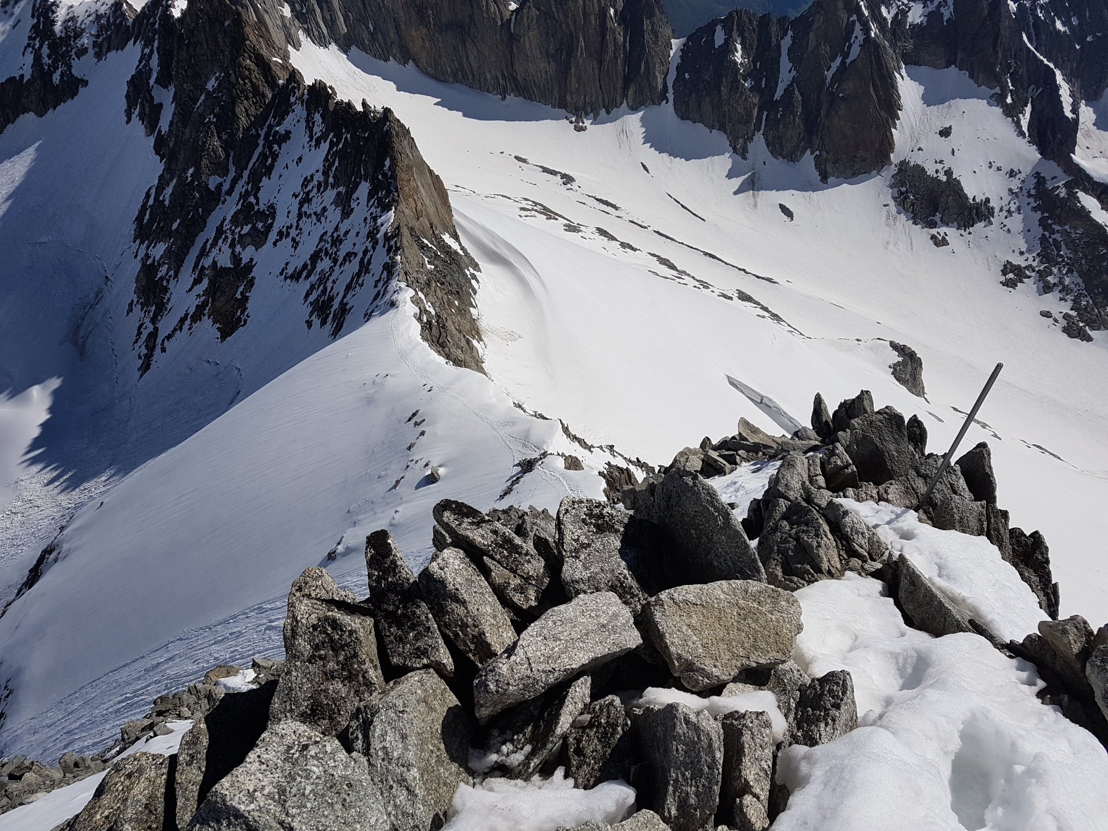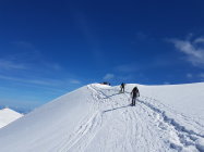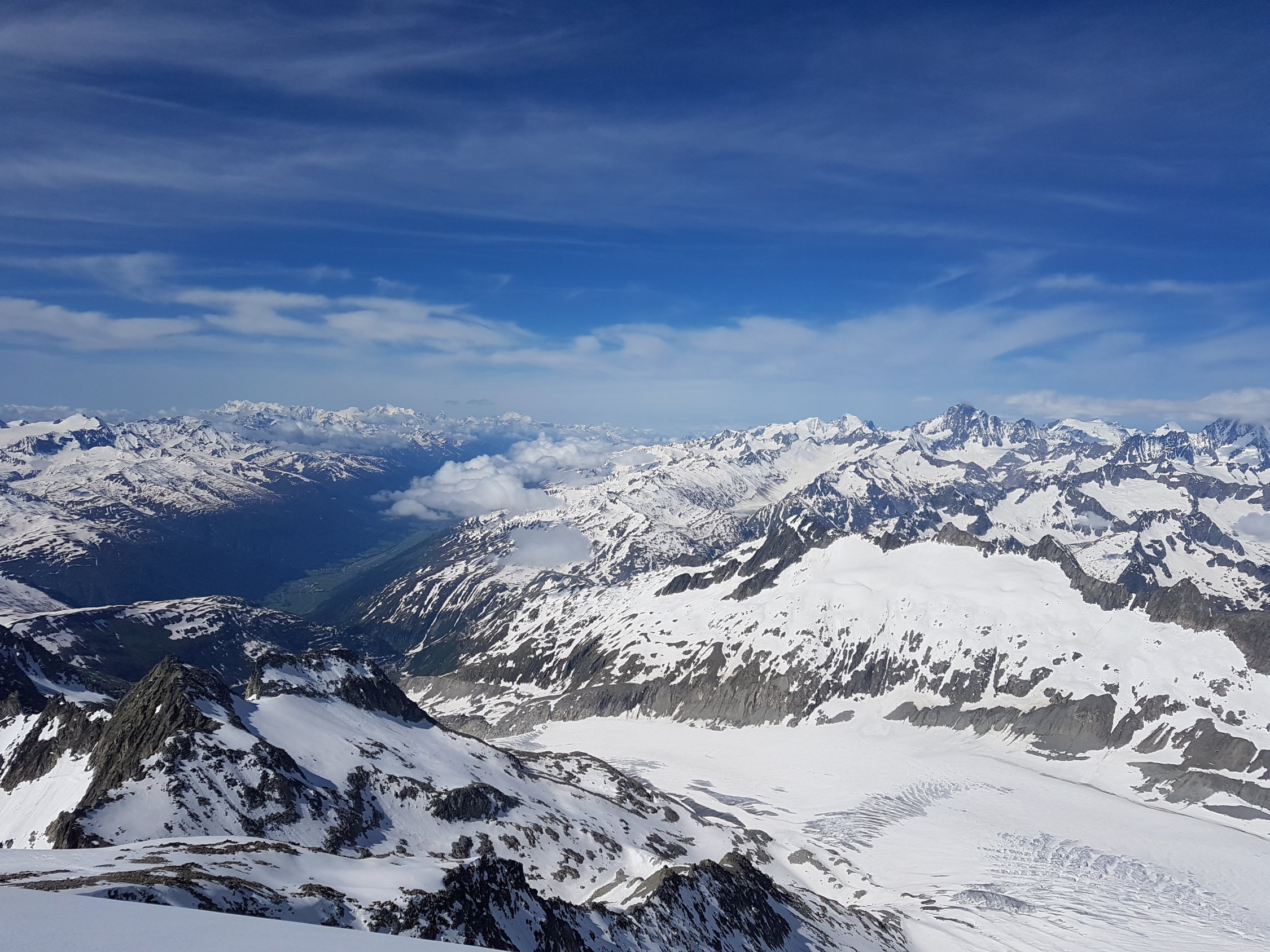 bei der Höhe von 3000m eine Tragestelle, aber schon bald konnten die Ski wieder montiert werden hinauf zum Skidepot auf 3500 Meter. mit Steigeisen und Pickel ging es entlag des Grates zum Galenstocks, vorsicht auf Wechten in Richtung Norden, am Gipfel kein Wind mit recht guter Rundsicht.
