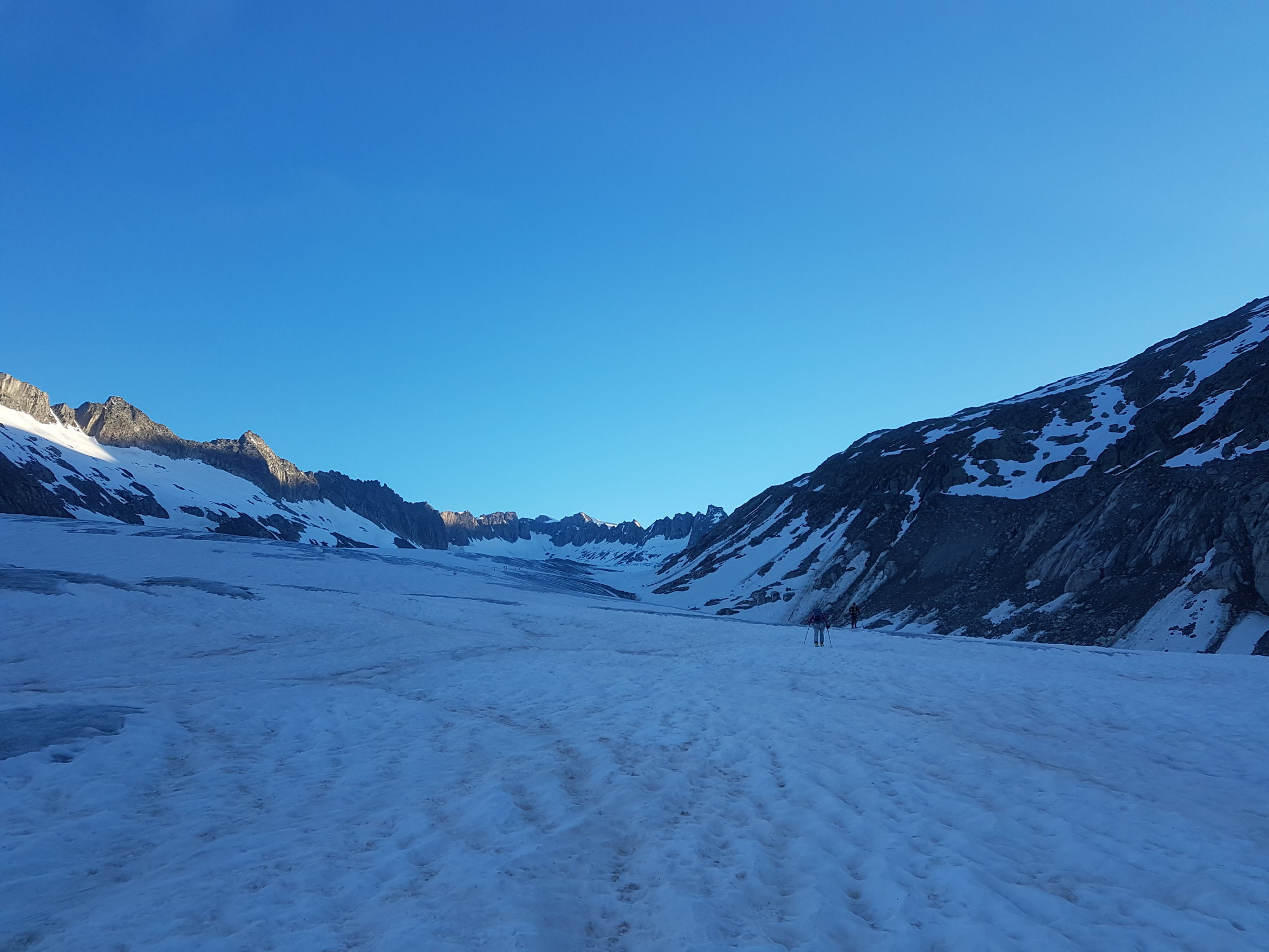Bei der Anfahrt war es am frühen Morgen zuhause noch 17°, der Parkplatz beim Belvedere war schon ziemlich voll, beim Tourenstart am 5.50 Uhr etwas kühler mit +7°, der Aufstieg durch den Rhonegletscher zuerst nicht durchgefroren mit schon einigen Blankeisstellen, beim Abzweiger hoch in Richtung Galenstock dann Schneedecke durchgefroren, die Harscheisen waren heute bitter nötig,