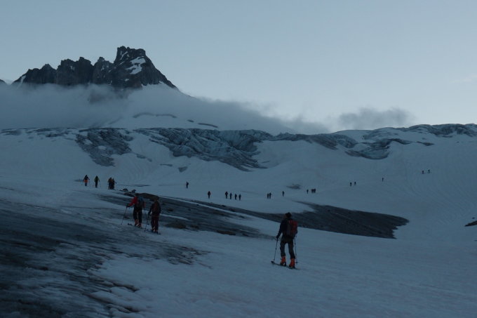 Abfahrt um 11:20 war auch noch ok (wir haben im Aufstieg das Sidelenhorn mitgenommen). Den steilen Hang in der Direktabfahrt über den Galengletscher sind wir ganz links abgefahren. Immer noch gut tragend und leicht angesulzt, da länger im Schatten.