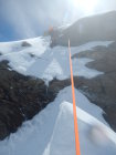 Aktuell sind Schneeschuhe eine gute Wahl im Gebiet, gerade auch dieser Tour. Man sollte Schneeschuhe oder Ski auf dem Grat am Rucksack tragen in der Route. Die Schneeschuhe stören beim Klettern weniger als Ski am Rucksack. Zu Fuß würde man beim Abstieg unterhalb der Flanken tief einsinken bei Rückkehr zu einem Skidepot. Bei Abstieg am frühen Nachmittag oberhalb der Ayas-Hütte im weichen Schnee auch mit Schneeschuhen ordentlich eingesunken.