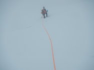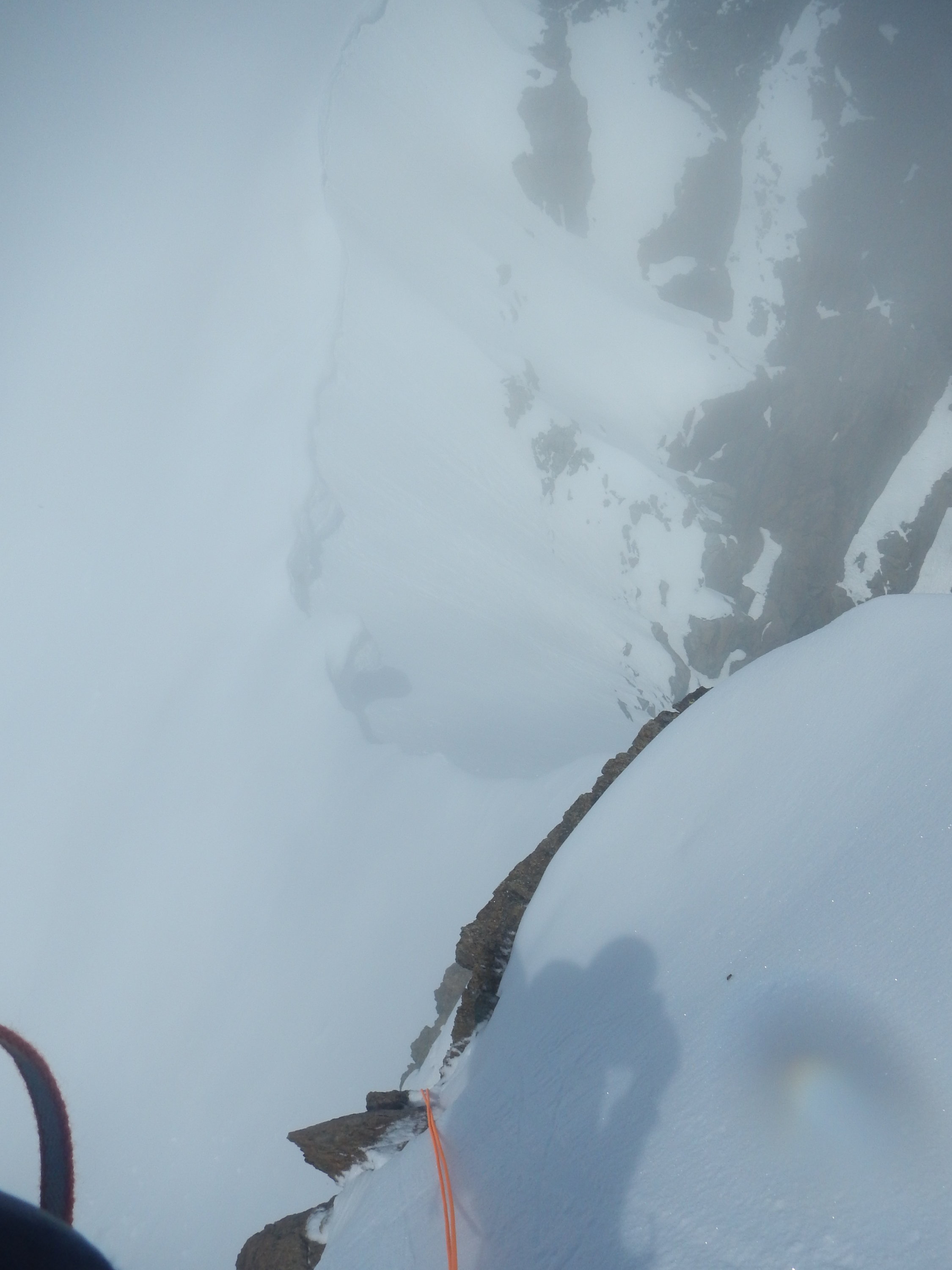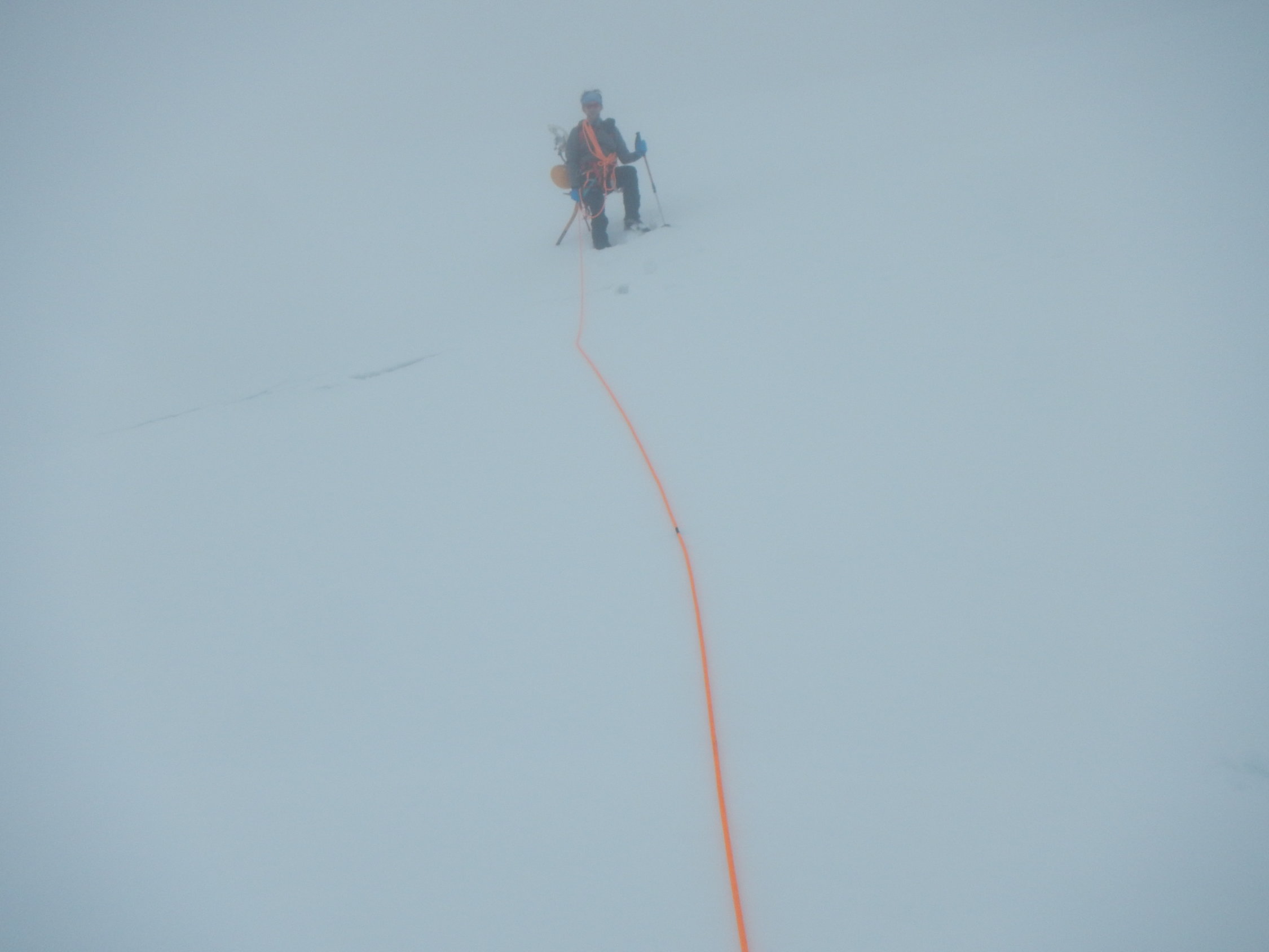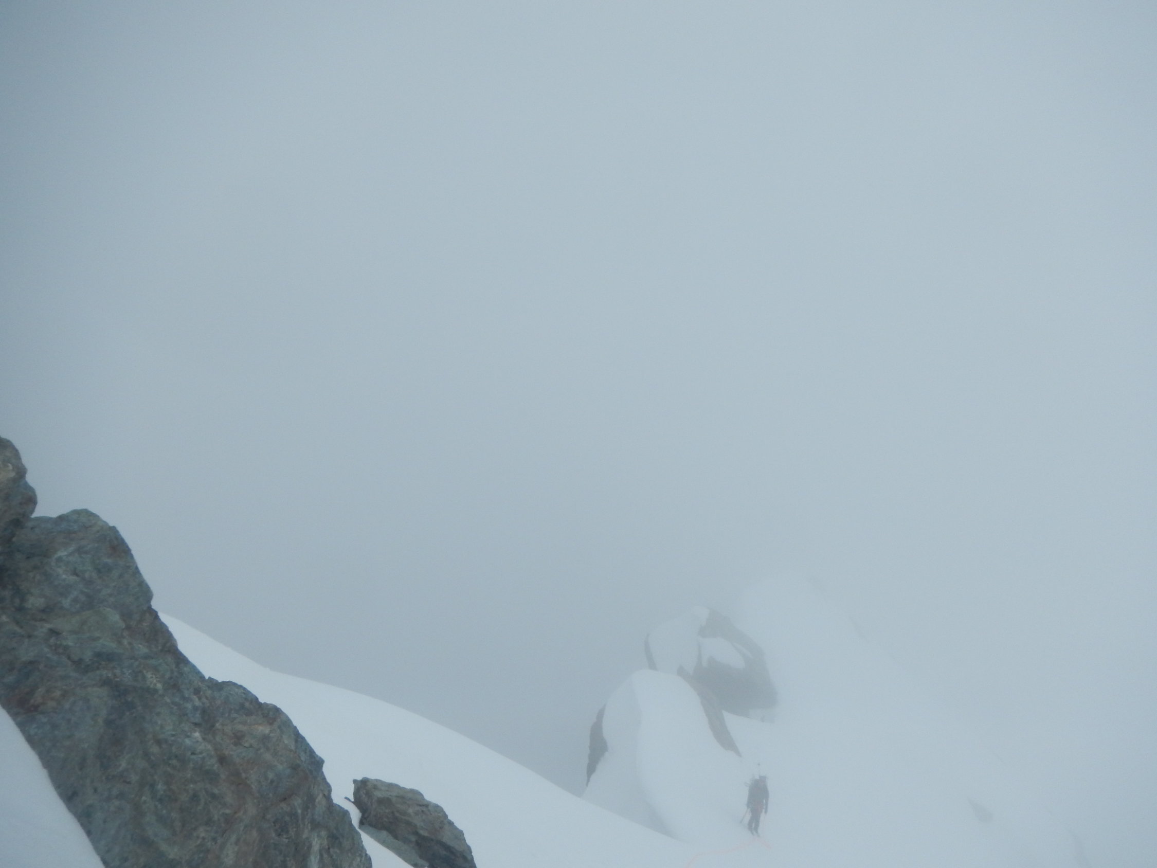 Im harten Firn ließ sich die steile Flanke zur Roccia Nera nach ordentlicher Abstrahlung in der Nacht morgens gut ersteigen. Im Übergang zu den Zwillingen kam dann immer wieder Nebel auf, der zusammen mit der fehlenden Spur, viel Schnee und somit teils unter Schnee befindlichen Abseilstellen die Tour anspruchsvoller gestaltet hat als das wahrscheinlich im Sommer der Fall ist. Da wir die Abseilstelle vom Breithorn-Westzwilling im White out nicht gefunden haben, sind wir zurück zur Scharte zwischen beiden Zwillingen und von dort aus die mäßig steile Flanke abgestiegen.