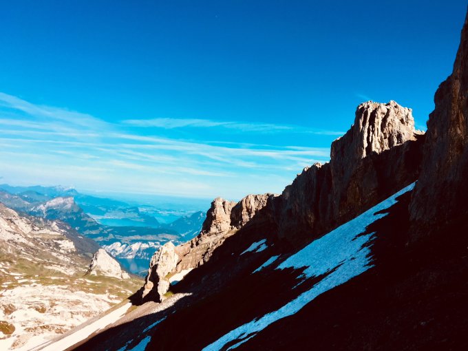 Abwechslungsreiche und sehr schöne MSL in der Westwand des Chaiserstocks. Zustieg teils noch mit Schneefeldern aber wohl nicht mehr lange. Aufgrund Westexposition eher lange im Schatten, was vor allem am Anfang zu sehr kalten Finger führt. Nur eine weitere 2er Seilschaft war noch in der Wand.