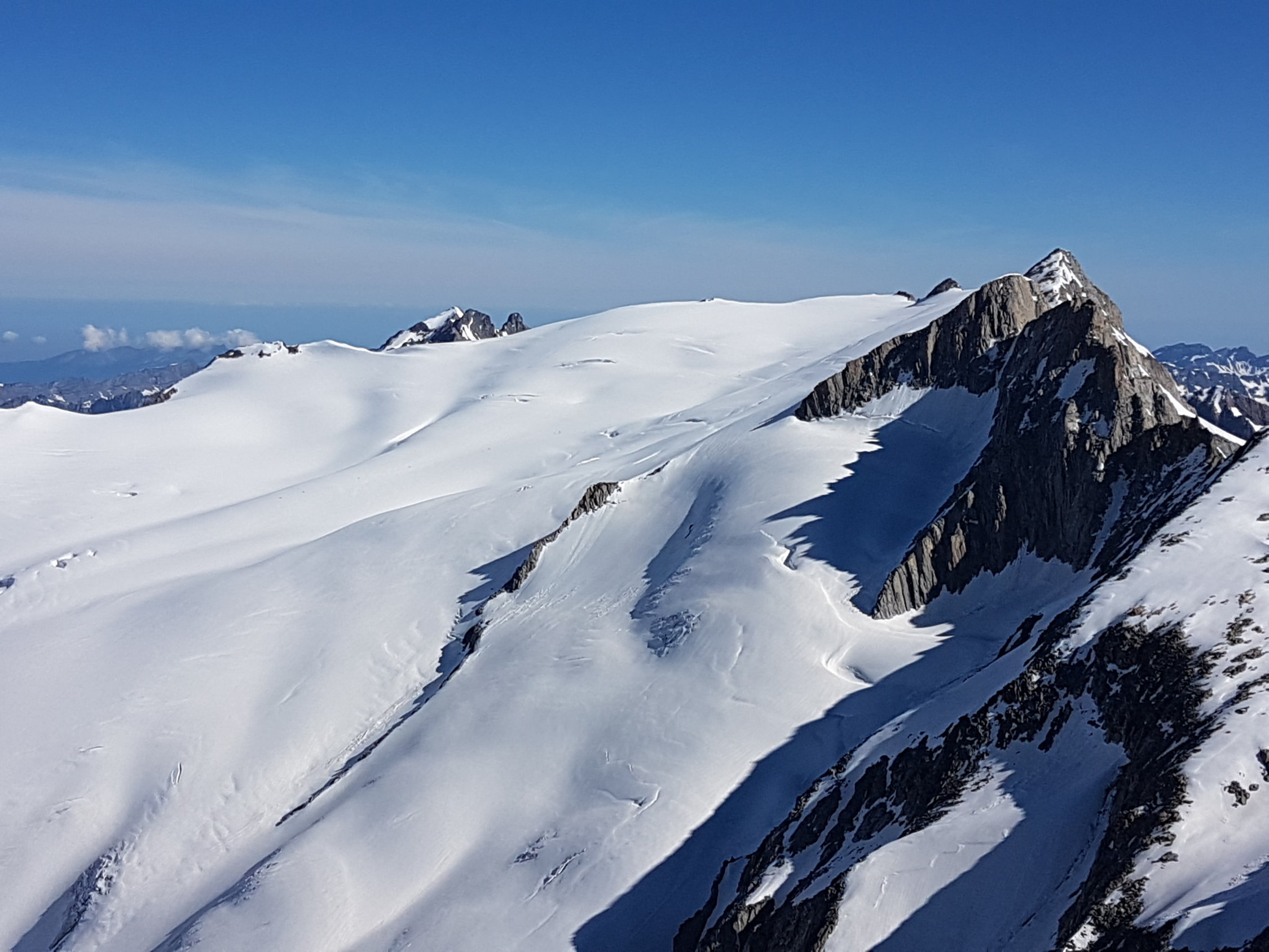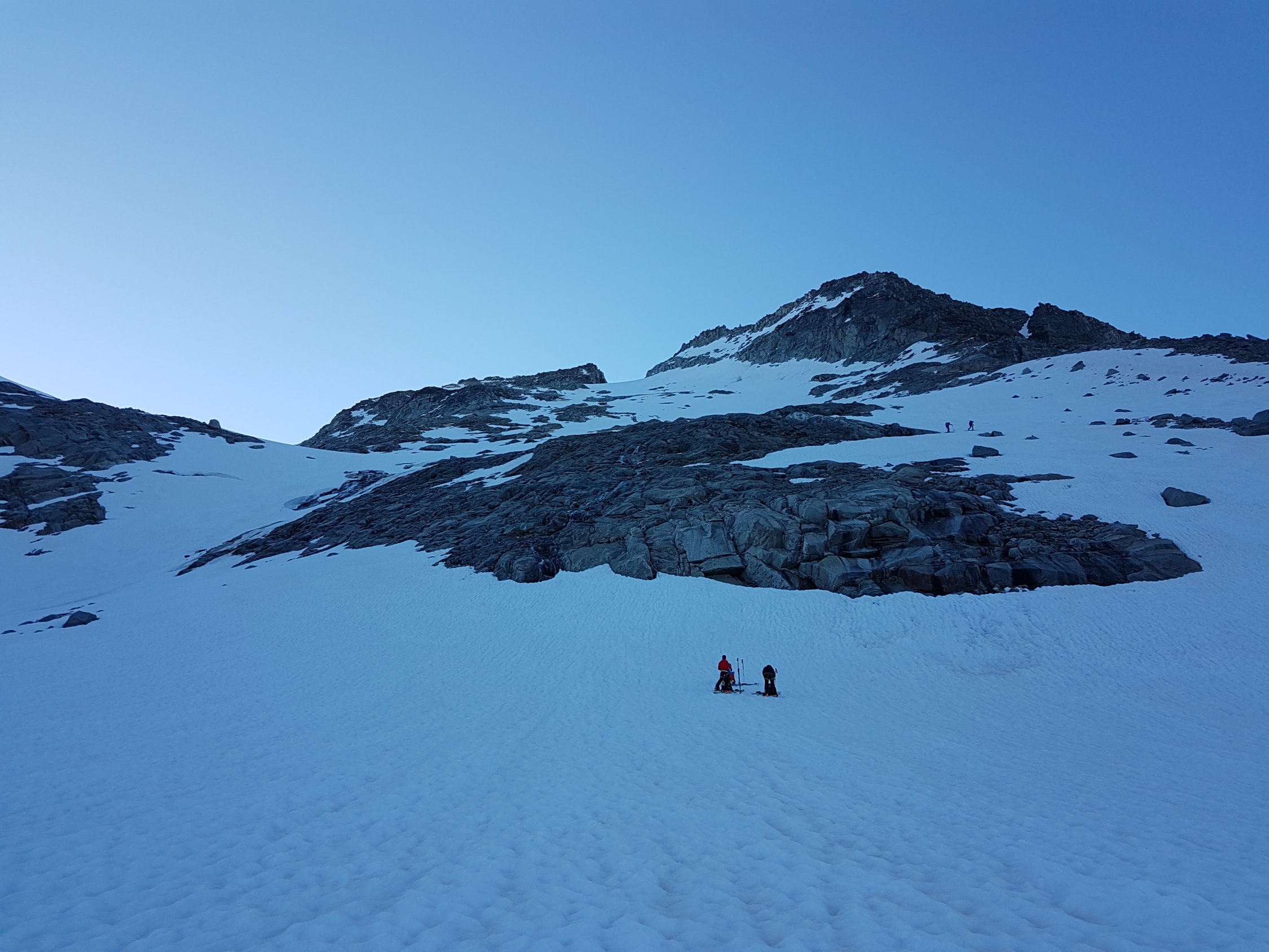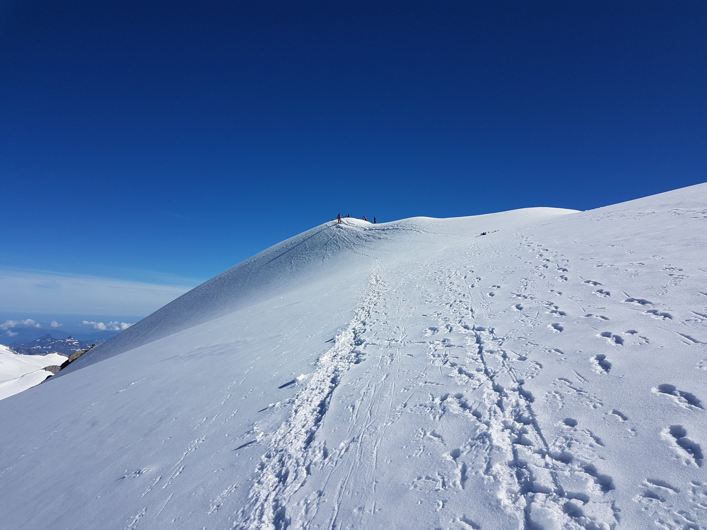 Schnee sehr gut durchgefroren, trotz aperer Stellen auf dem Gletscher guter Aufstieg. Ab ca. 2900 Harsteisen nützlich, hinten im Kessel bei den Felsen ein Stück zu Fuss mit Steigeisen, dann wieder mit Ski bis Skidepot. Etwa die Hälfte stieg mit Ski auf den Gipfel. In der Abfahrt dann oben leider noch nicht aufgesulzt und unten etwas ruppig aber bis zur Eisgrotte zu fahren. Hammertag!