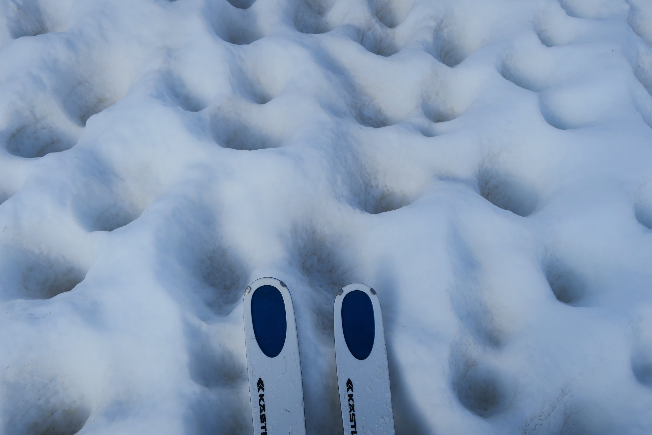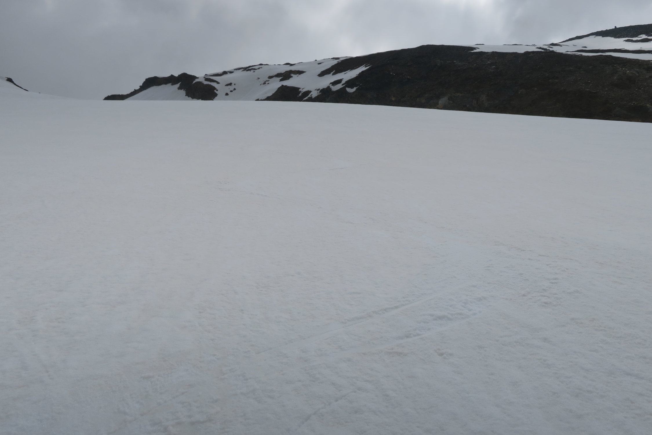 Darüber gut gefrorene Schneedecke. Gletscherbruch nicht mehr durchgehend mit Ski möglich. Wählte im Aufstieg die rechte Variante - bei der Abfahrt die mittlere - Steigeisen nötig. Skitourengeher waren nur 4 Unterwegs - jedoch sicher 30 Hochtourengeher bzw. Gletscherkurse. Gipfel steckte dann in Wolken und als es kurz aufriss fuhr ich ab - 11Uhr - war noch zu früh. Nur leicht aufgefirnt.