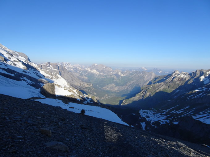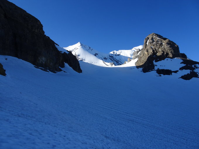 Der Gletscher ist perfekt eingeschneit. Im Bruch der ersten Spaltenzone unterhalb der Wildi Frou sieht man derzeit keine offenen Löcher oder Spalten. Die Fläche bis zur beginnenden Steilflanke hat noch viel Schnee. Teilweise Lawinenkegel von Lawinen au der Steilflanke. Die Flanke selber kann ganz links über den Rücken "am Abgrund" hochgestiegen werden oder leicht in der Mitte. Der grosse Bergschrund ist derzeit über eine Schneebrücke auf der östlichen Seite überstiegen werde. Gemäss Infos von anderen Tourengänger ist die Brücke nicht mehr so stabil. Wir sind erst die Mitte hoch und dann gegen links auf den Kamm. Abstieg analog. Unter der Hütte kann auf Schneefelder bis auf fast 2100 runter runtergerutscht werden.