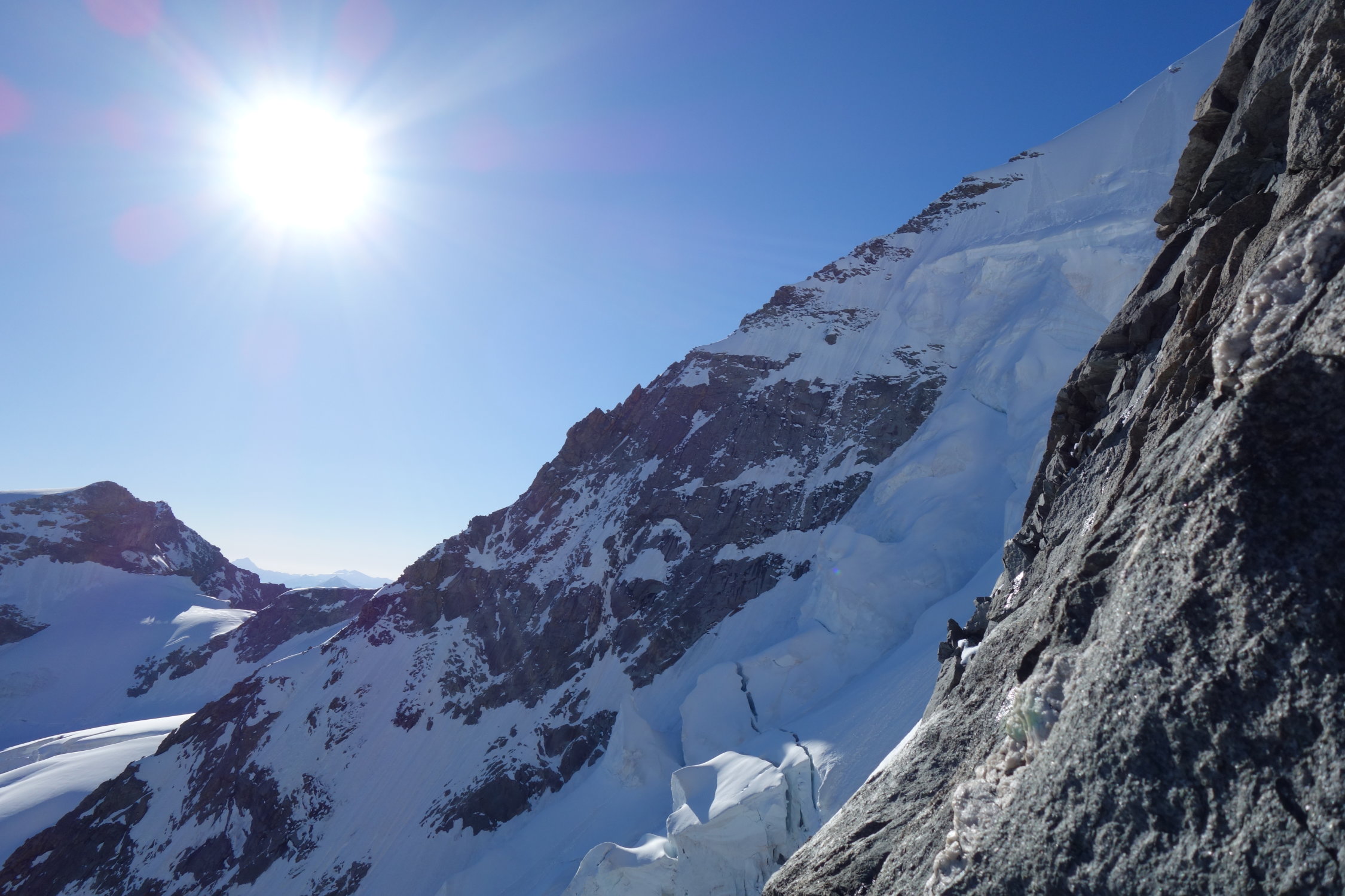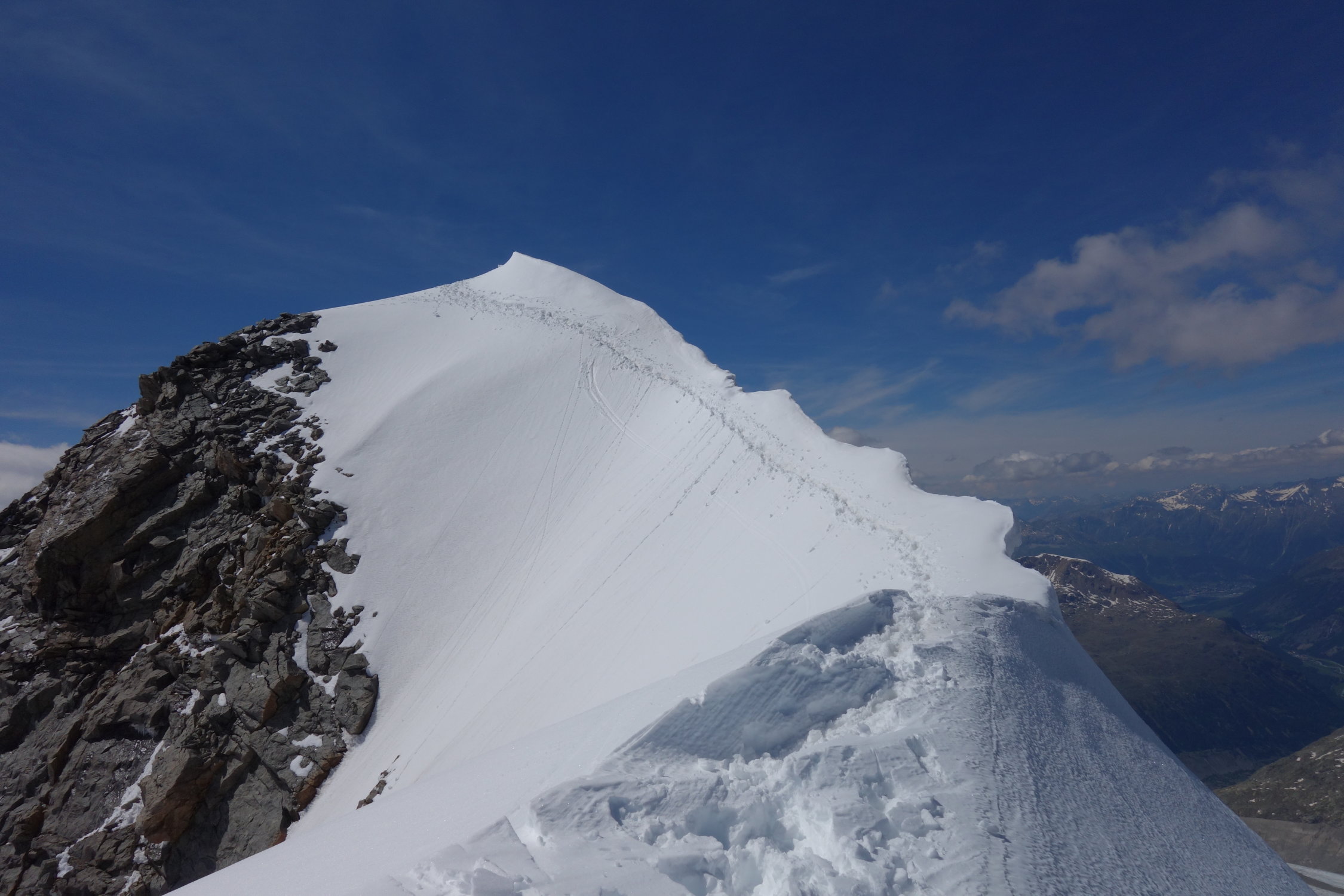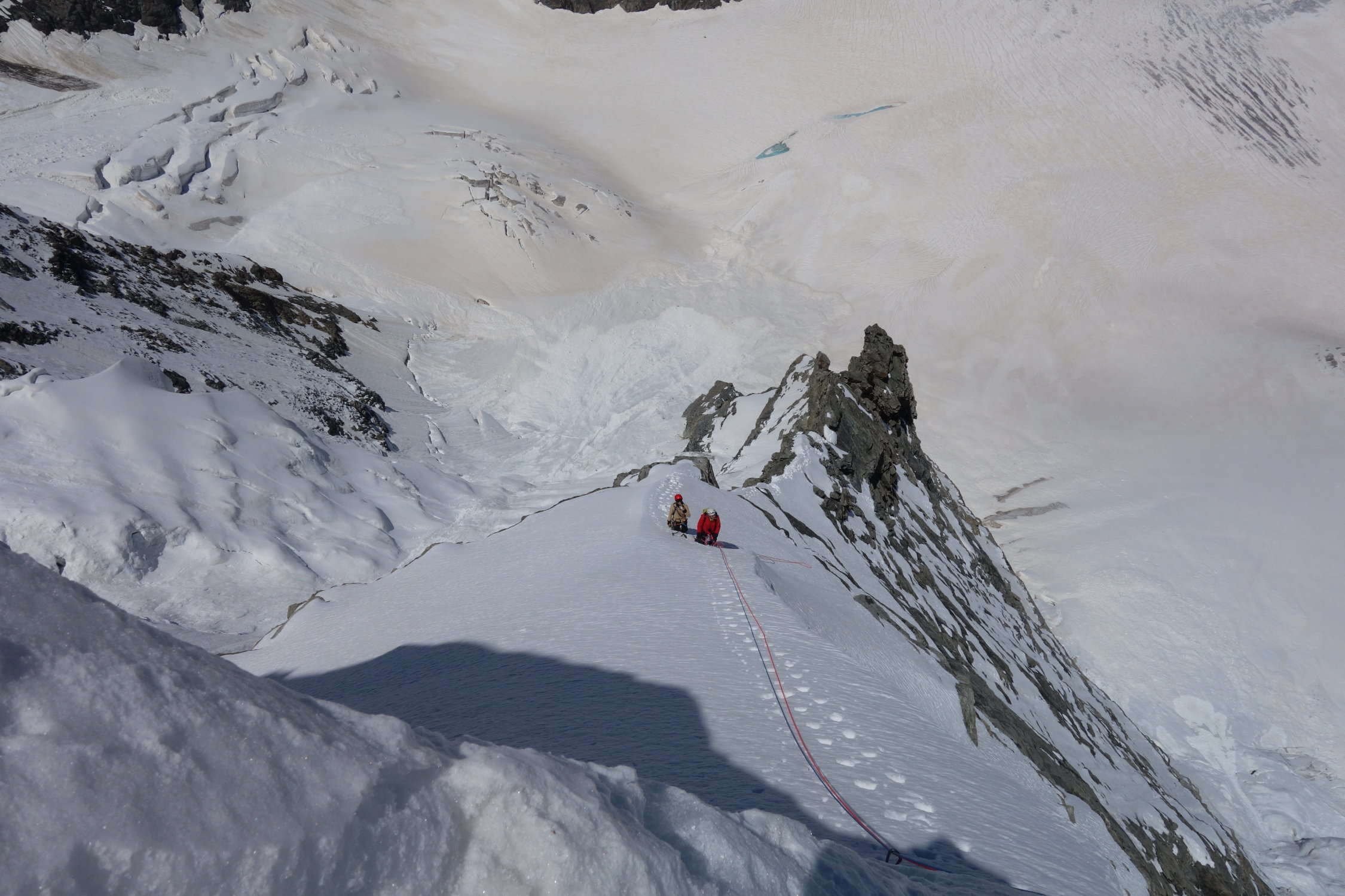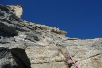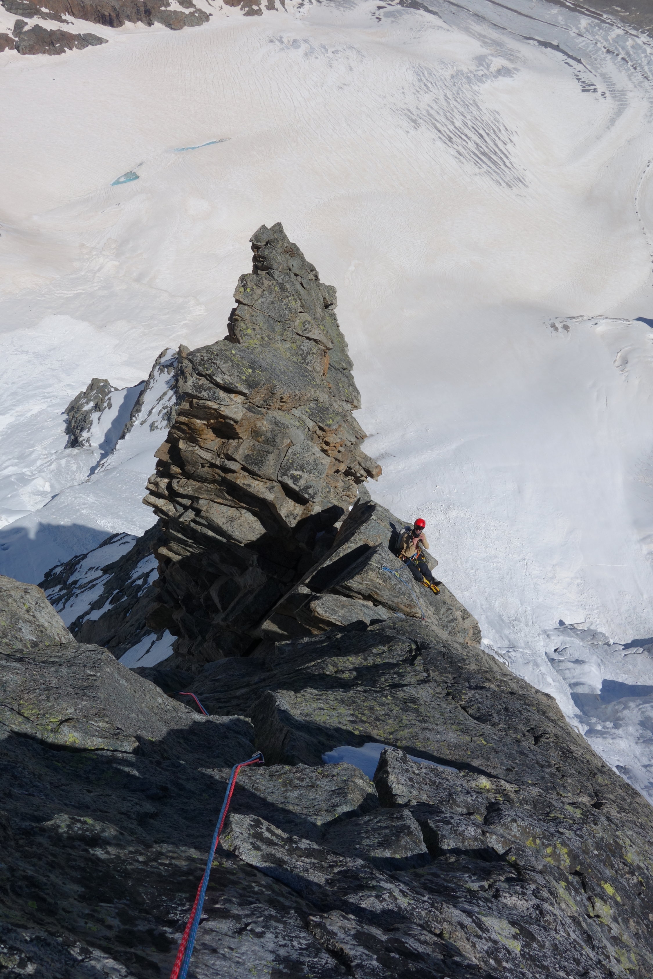 Dann quert man auf den Firngrat und kommt so zum Ansatz der zweiten Felspartie.