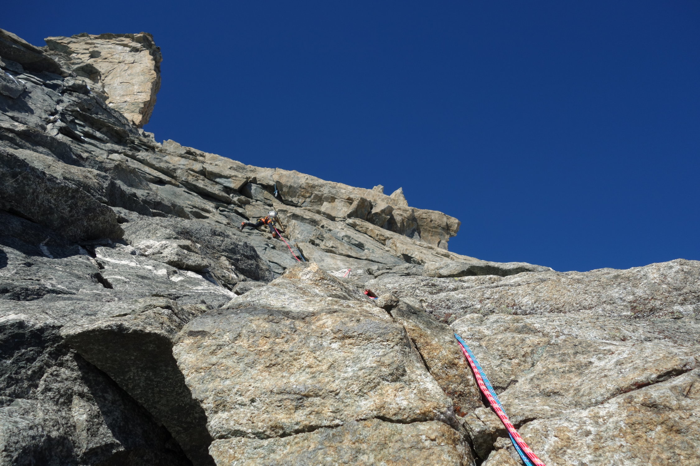(meist um die 40 m) in meist toller Kletterei an meist sehr gutem Granit, immer etwas links der Pfeilerkante, empor.