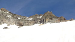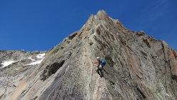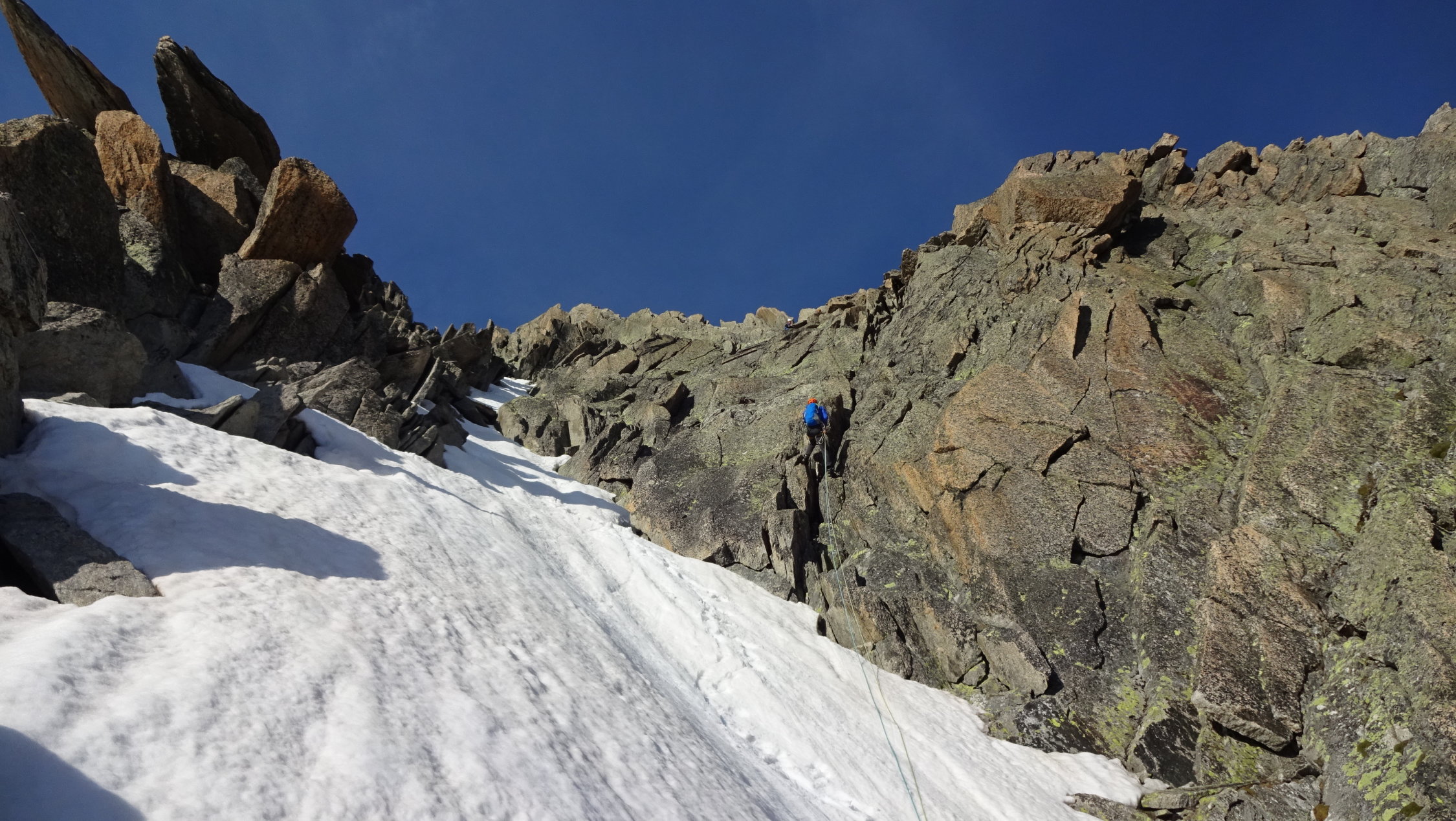 Grat ist schneefrei und gut mit Bergschuhen kletterbar, alpin abgesichert, Keile, Friends und Schlingen sind angeraten