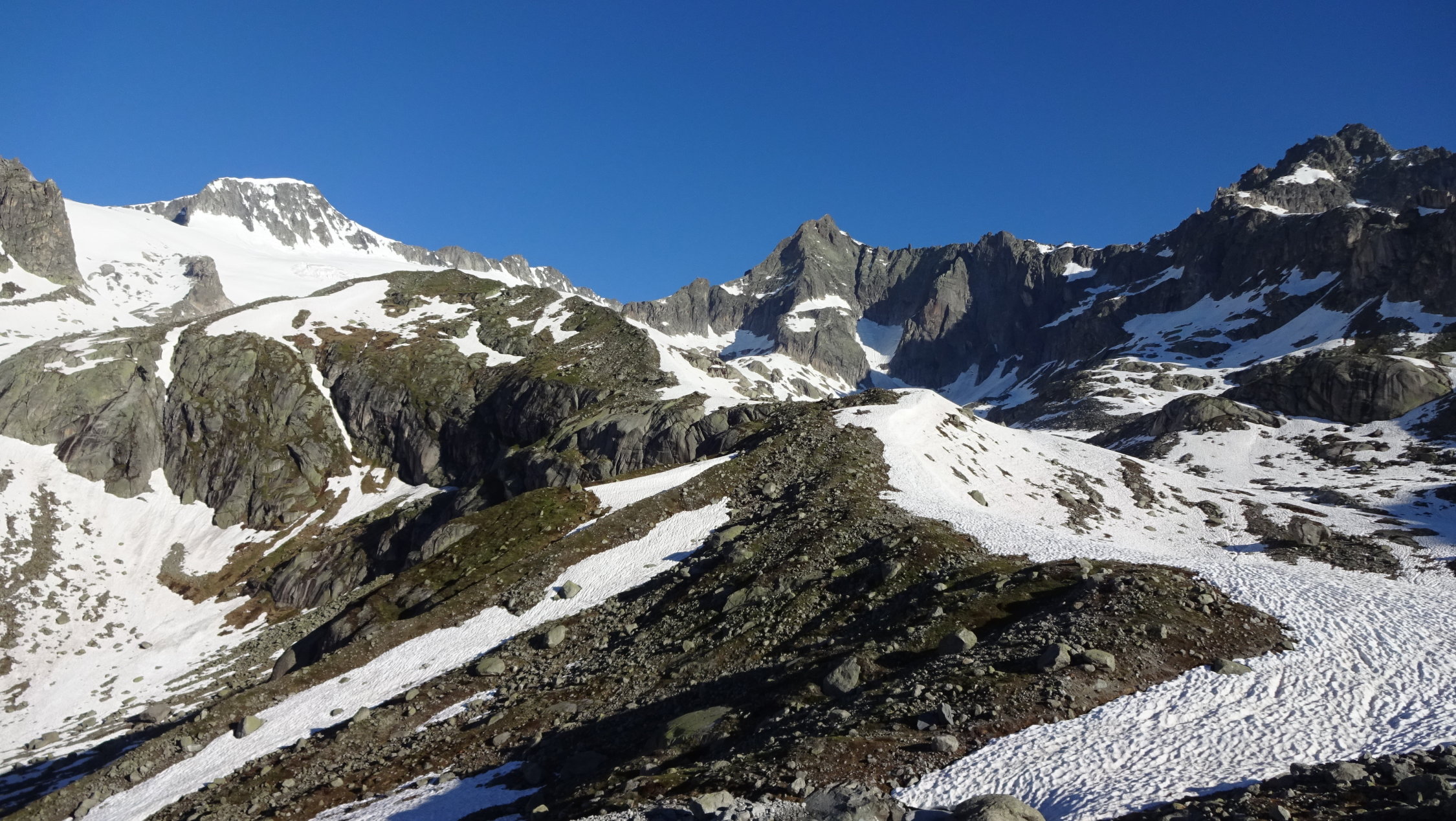durchgehende Schneedecke erst ab 2400hm (unterhalb Albert-Heim-Hütte),