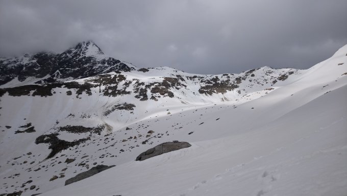 Kurz nach Almagellerhütte bis Zwischbergenpass noch tiefer Winter (schneebedeckt). Danach super Verhältnisse östlich des Südgrats guter Schnee zum Aufsteigen bis der Südgrat merklich aufsteilt (aktuell hat der Südgrat zwischen dem etwas flacheren Teil und dem Teil, wo's etwas steiler wird, eine schneebedeckte Stelle - wir sind ziemlich am Ende dieses Schneegrats zum Grat gequert und auf den Grat gewechselt).