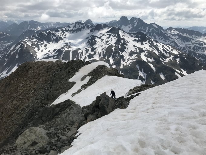Von Dürrboden Ski tragen bis auf 2500 m, dann mit kurzen Unterbrüchen Büsserschnee bis zum Skidepot. Grat zum Gipfel komplett ausgeapert und trocken, am Gipfel noch ein kurzes Schneefeld.