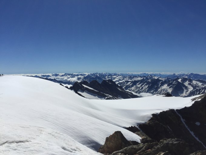 Wenn man an einem solchen Tag einen so schönen Gipfel machen kann, muss man ja das ausgezeichnet-Smiley nehmen. Aber ich möchte nicht verschweigen, dass die Verhältnisse für eine Skitour hier heute anspruchsvoll waren. Zuerst Skitragen vom Umpol PP bis auf den Gletscher. Anfellen macht hier keinen Sinn, man müsste zu oft ausziehen. Dann problemlos auf dem Steigletscher über den bekannten, mühsamen Regenlöcher-Schnee bis zum ersten Bruch. Der ist inzwischen nirgends mehr durchgängig schneebedeckt. Also Steigeisen und Pickel, Ski wieder am Buckel. Da es heute gut gefroren war, war das zu verantworten, auch wenn ich unterwegs völlig alleine war. Weiter oben wieder Ski an die Füsse, die Regenlöcher teils enorm gross und bis knapp unter das Plateau auf knapp 3000 Meter! Muss das geschifft haben... Im Steilen so mühsam zu fellen, dass ich die Ski lieber wieder getragen habe. Obendran bis zum Gipfel endlich ein schöner Firn-/Sulz-Teppich. Entsprechend ohne Probleme zum Gipfel. Dort war eine Gruppe laute Franzosen (ohne Ski, es hatte nur 2 Skibergsteiger heute im Gebiet), die jedoch bald abstiegen. Ich genoss die Stille und die absolut wunderbaren Aussichten, die dieser Traumtag heute bot. Die Abfahrt war oben ein Traum, eeeendlich wieder mal ein schöner Sulz! Man fand auch weiter unten im 2. Bruch immer noch relativ glatte Flächen, die schöne Schwünge ermöglichten. Dann bis zum ersten Bruch diese doofen Löcher, henu, man kommt runter. Den ersten Bruch musste ich wiederum auf Steigeisen abklettern, alles andere wäre mir zu riskant gewesen. Blankeis fahren ok, aber nicht bei 30 Grad Steilheit. Dann auf den relativ aufgeweichten, gut fahrbaren Löchern zu Tale rattern, nochmals ausziehen beim Chuöbärgli, dann konnte man noch runterfahren bis fast zum PP.