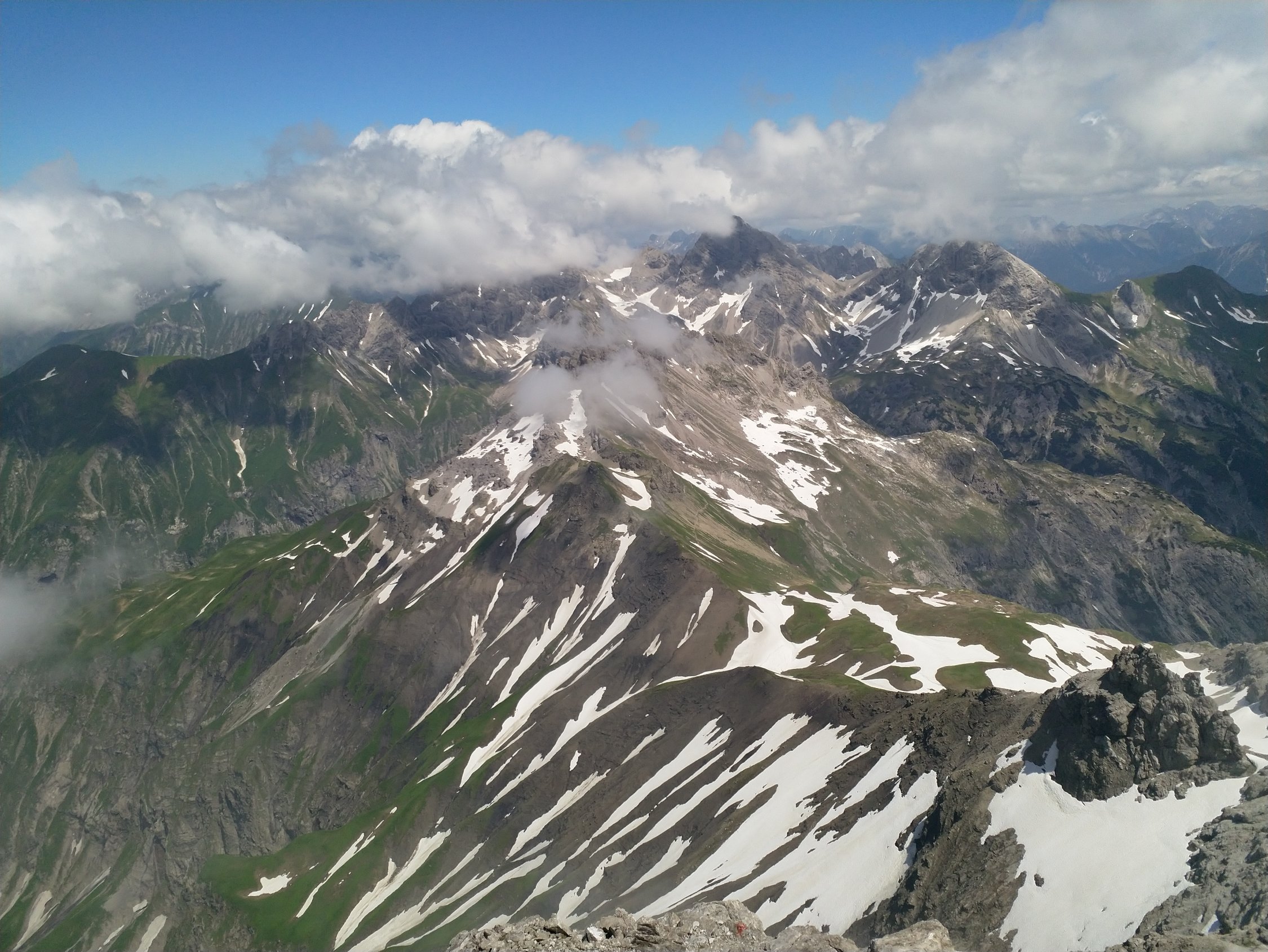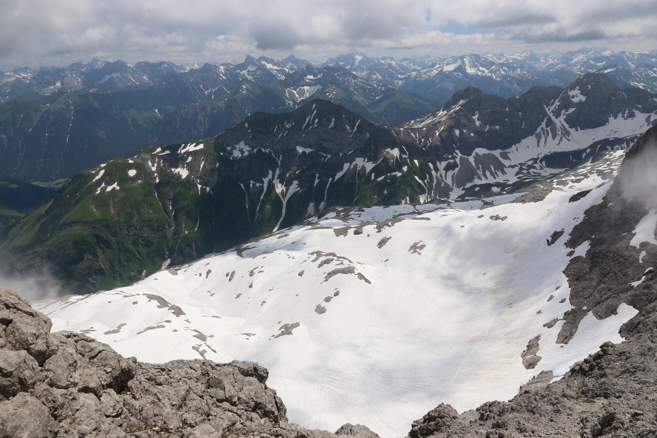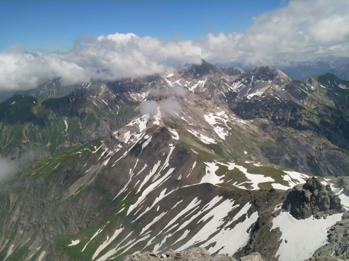 Im Tobel zur Kemptner Hütte teils Scheebrücken über dem Weg. Danach bis zum Mädelejoch problemlos - einige kleinere und größere Schneefelder im Heilbronner Weg unterhalb des Kratzers. Der Gipfelanstieg startet aus dem letzten großen Schneefeld heraus.