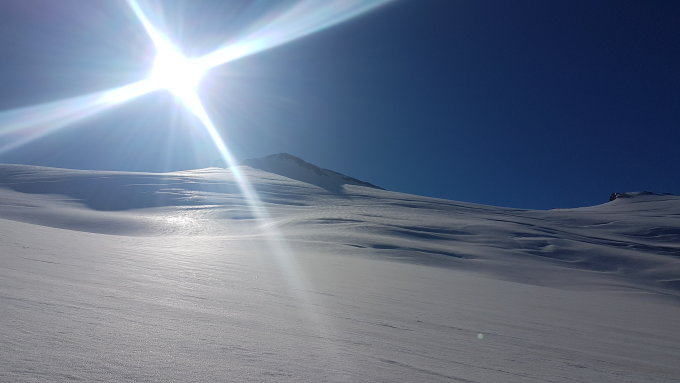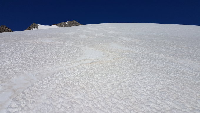 Ob 2900m top Verhältnisse, unten Kübeltiefe Löcher im Schnee.