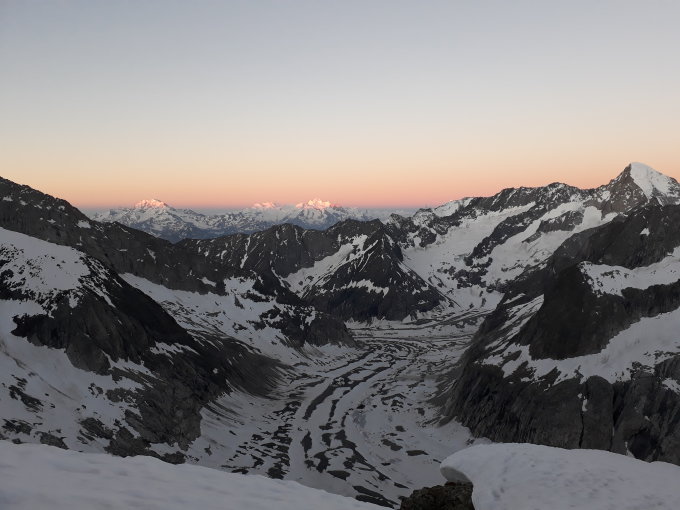 Es hat verhältnismässig noch viel Schnee im Oberaletschgebiet und am Aletschhorn selber. Nach einer klaren Nacht trafen wir auf beste Firnverhältnisse sowohl im Auf- wie auch noch im Abstieg um ca. 10.00 Uhr. Die Sicherungsstangen im oberen Drittel sind bis auf eine alle sichtbar. Der Gletscherschrund oberhalb des Felsgrates problemlos passierbar. Der Gletscher ist noch gut eingeschneit, die Spalten aber soweit klar ersichtlich.