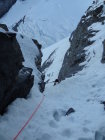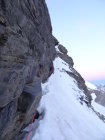 Schulterstand mit reichlich Schlingen ausgerüstet. Momentan ist auf dem Fels, auf welchem man steht, noch zusätzlich ca. 50 cm Firn. Somit wird das Überwinden des Überhanges nochmals einfacher.