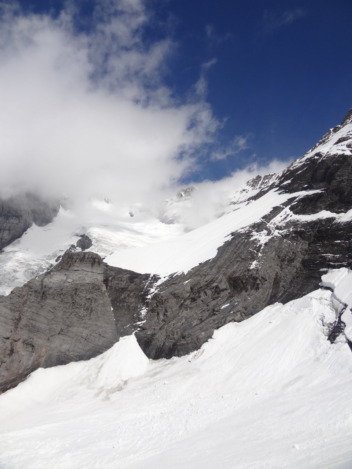 Querung ebenfalls alles im Firn, nahe am Fels z.T. tiefe Tropflöcher im Schnee, geht aber gut. Absicherung mit Friends machbar.