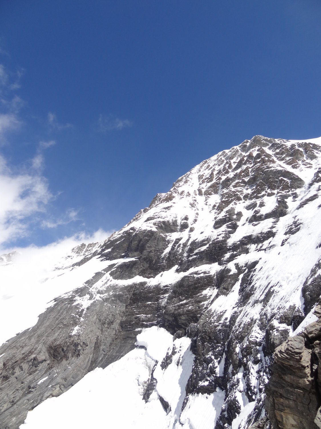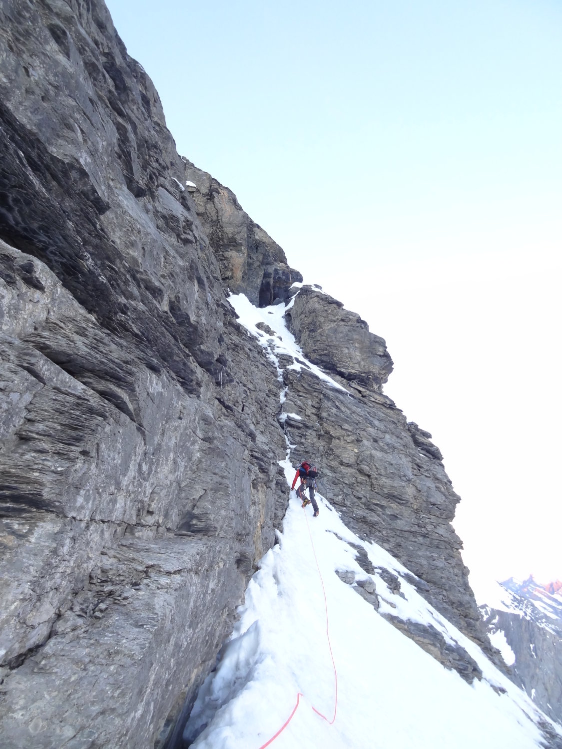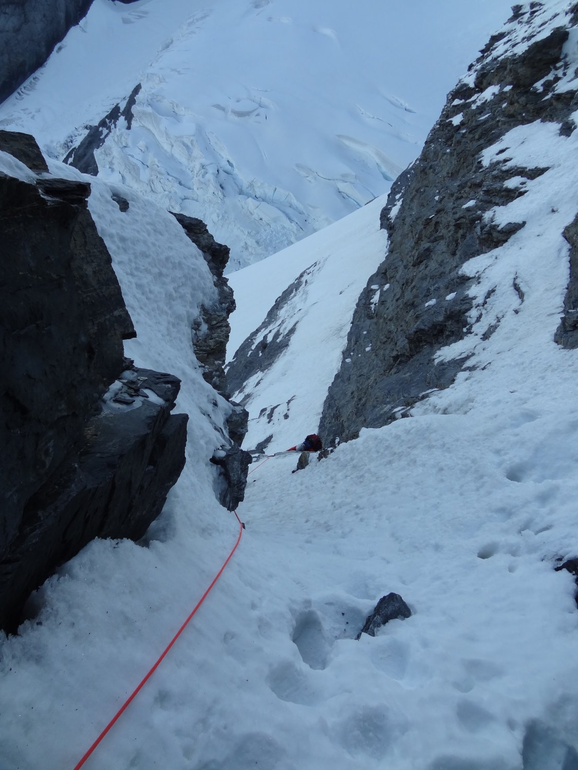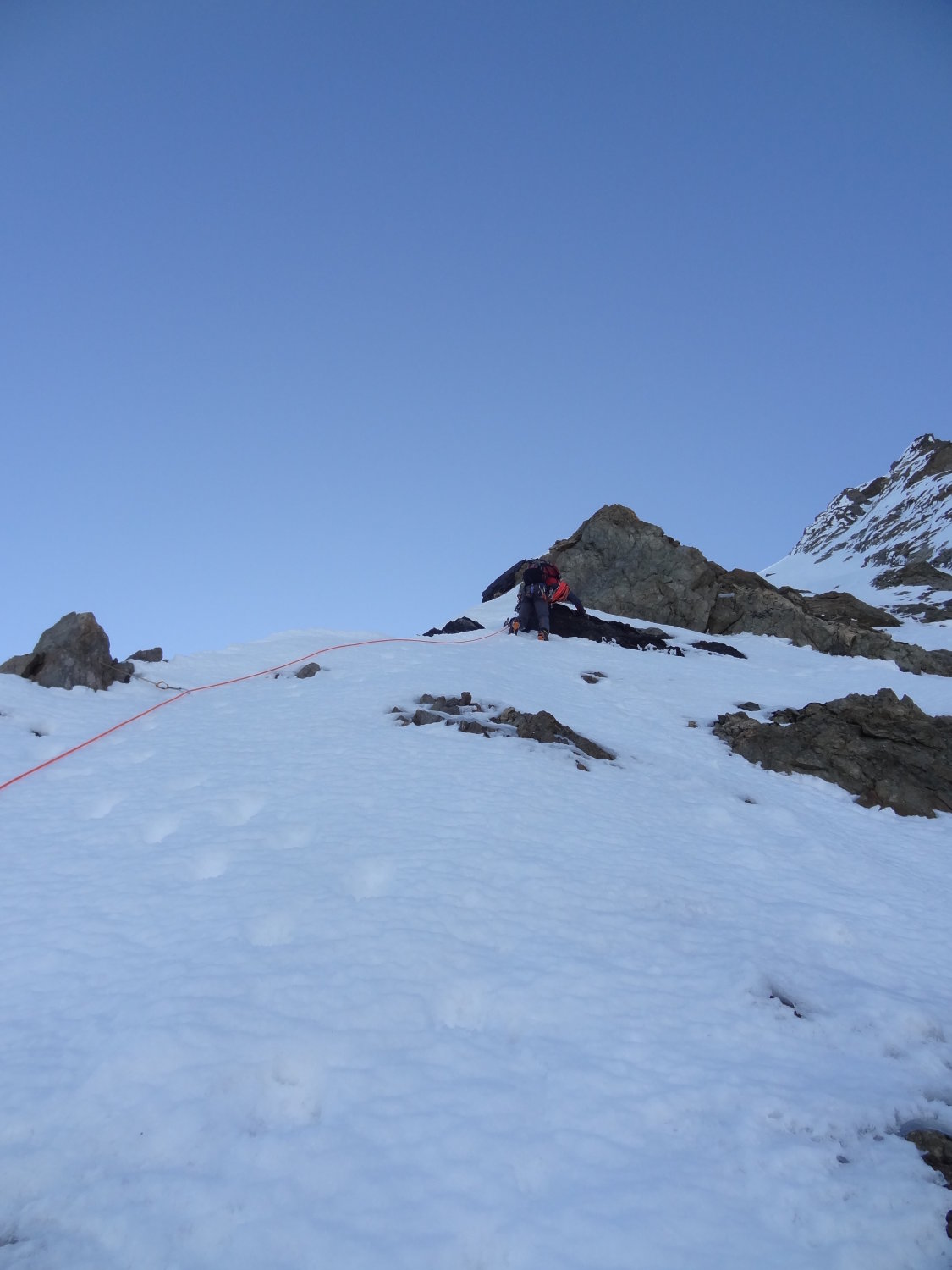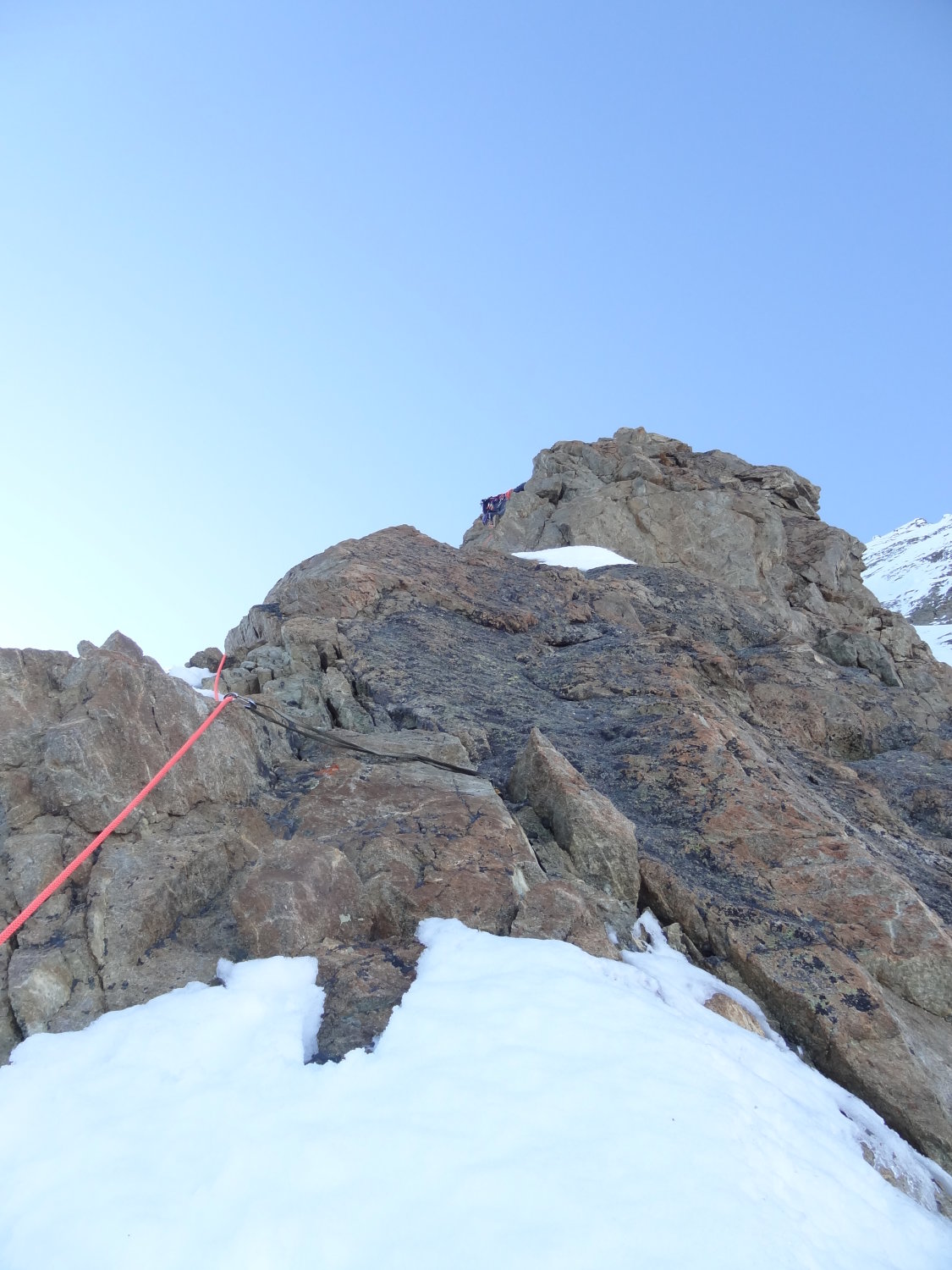 Gneisrippe z.T. noch etwas eingeschneit, stört aber nicht. Couloir-Variante wäre auch möglich, will man direkt von vom Beginn der Rippe ins Couloir, muss mit etwas Blankeis gerechnet werden.