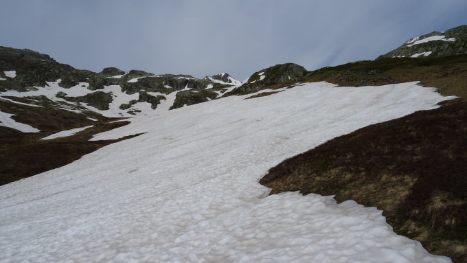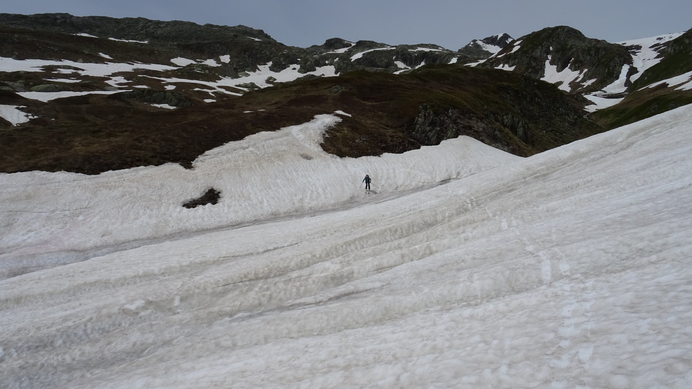 Nach dem gestrigen Regenrinnen Abfahrts-Debakel am Blinnenhorn, kam heute direkt wieder richtiges Fahrfeeling auf. Die Schneedecke ist durchgehend ab Parkplatz mit einer kurzen 10-Meter Strecke übers Gras. Auch hier hat es die obligaten Regenrinnen, die aber bei weitem nicht so tief sind und dies nur in den flachen Passagen. Die steileren Hänge waren allesamt gut zu fahren.