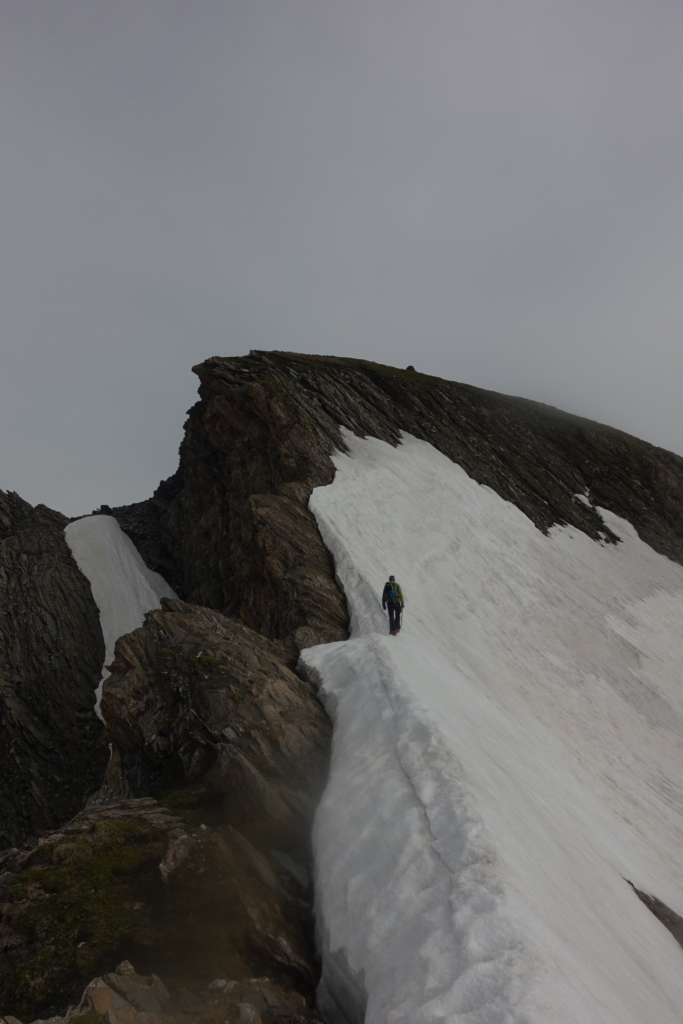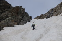 ca. 1 std skitragen auf erstes plateau,aufstieg durch culirechts(35-45°)mit steigeisen,da gut abgestrahlt gleich weiter über plateau bis skidepot zu fuss.gipfelgrat aper.