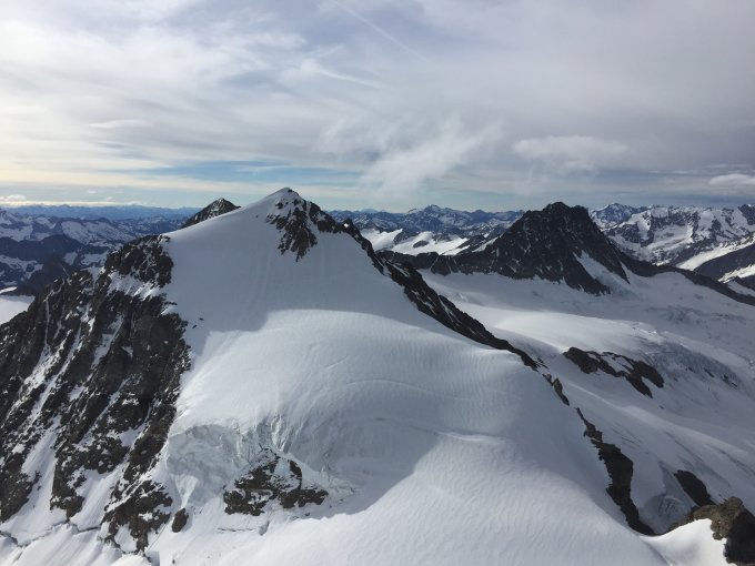 Weiterer Aufstieg zum Mittelhorn durchweg harter Firnschnee, der Übergang in die Gipfelfelsen problemlos. Abstieg Richtung Rosenhorn bis zur Abstiegsrinne ebenfalls im guten Firn zu gehen. Die Abstiegsrinne Richtung Augen noch durchgängig mit hartem Firn gefüllt, anhaltend steil. Randkluft zum Gletscher mit kurzem Sprung gut machbar. Beim Abstieg zu den Augen müssen Gletschspalten teilweise ausholend umgangen werden. Es lohnt sich vorab über die Lage der Abseilstelle zu informieren. Insgesamt eine lange Tour mit Abstieg nach Grindelwald, die sich aber absolut lohnt.