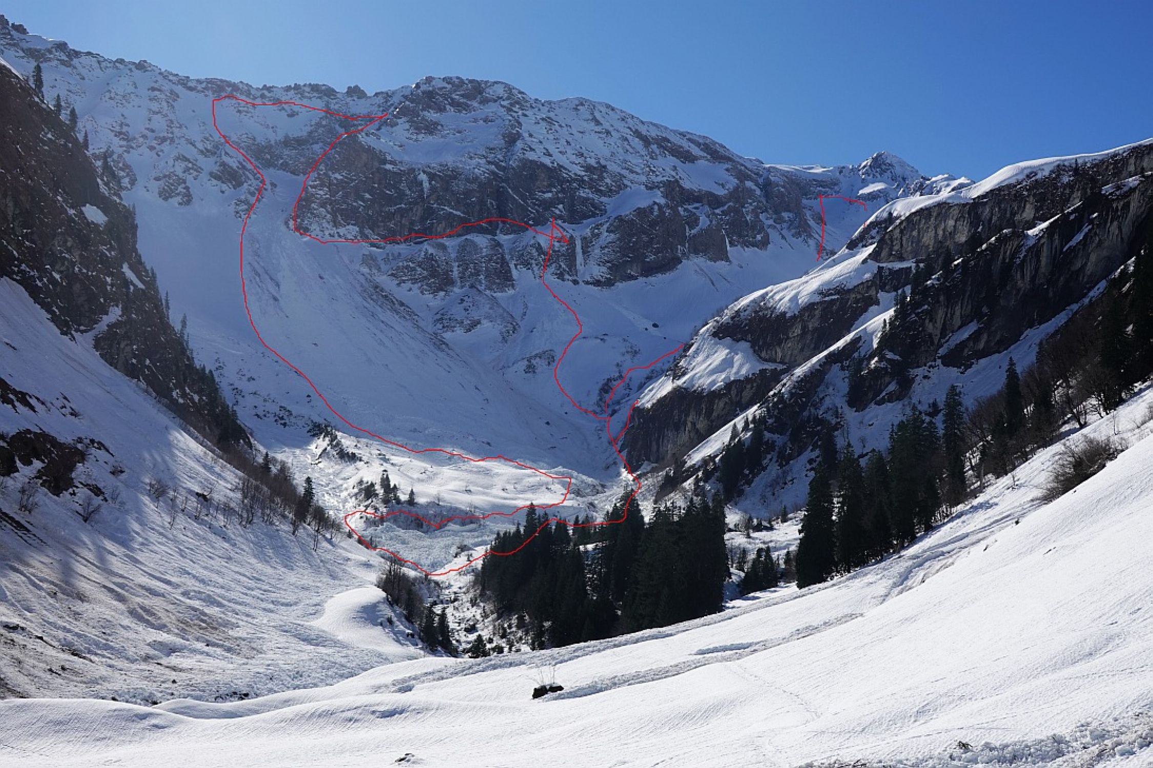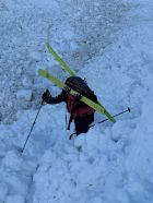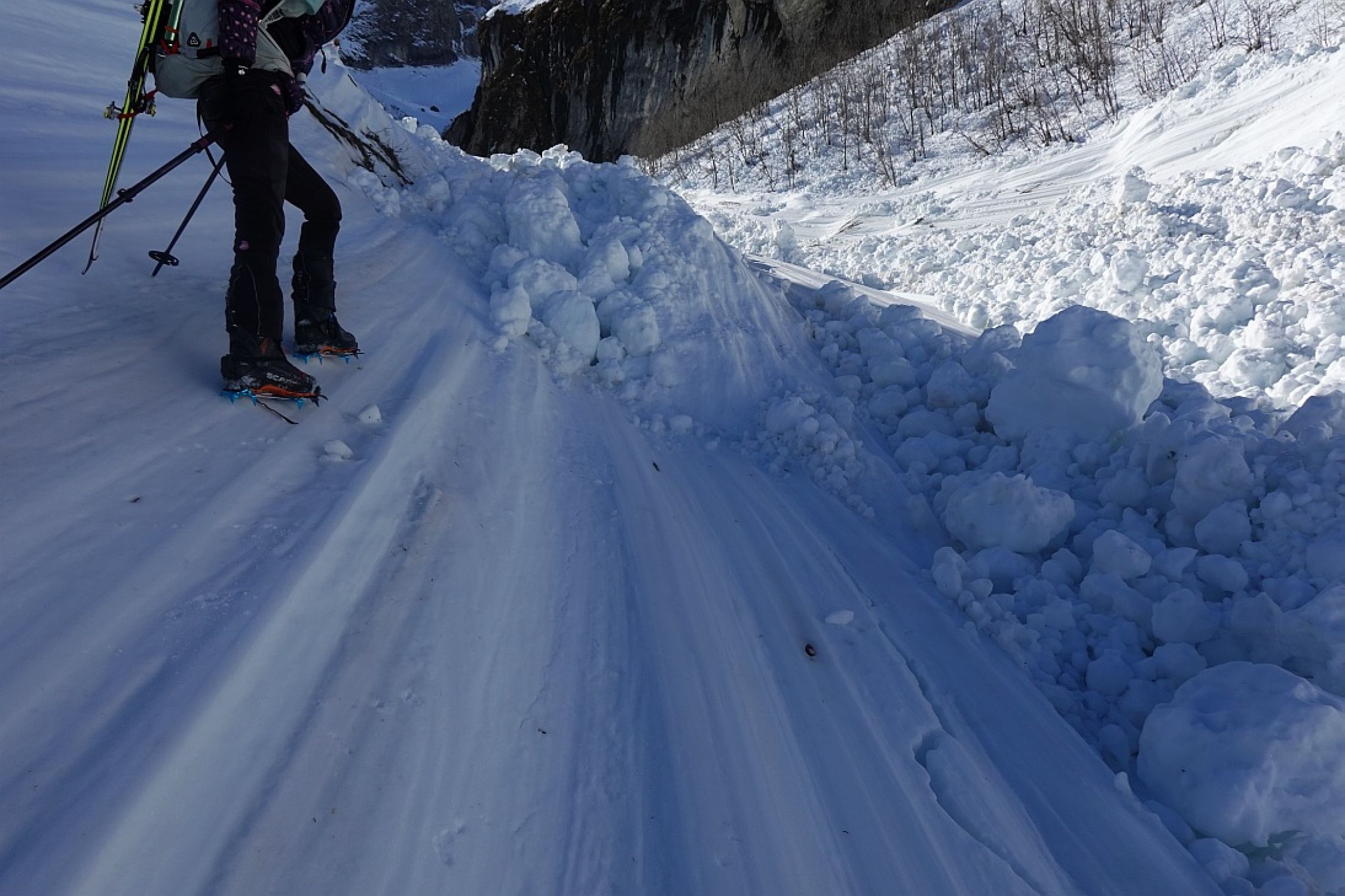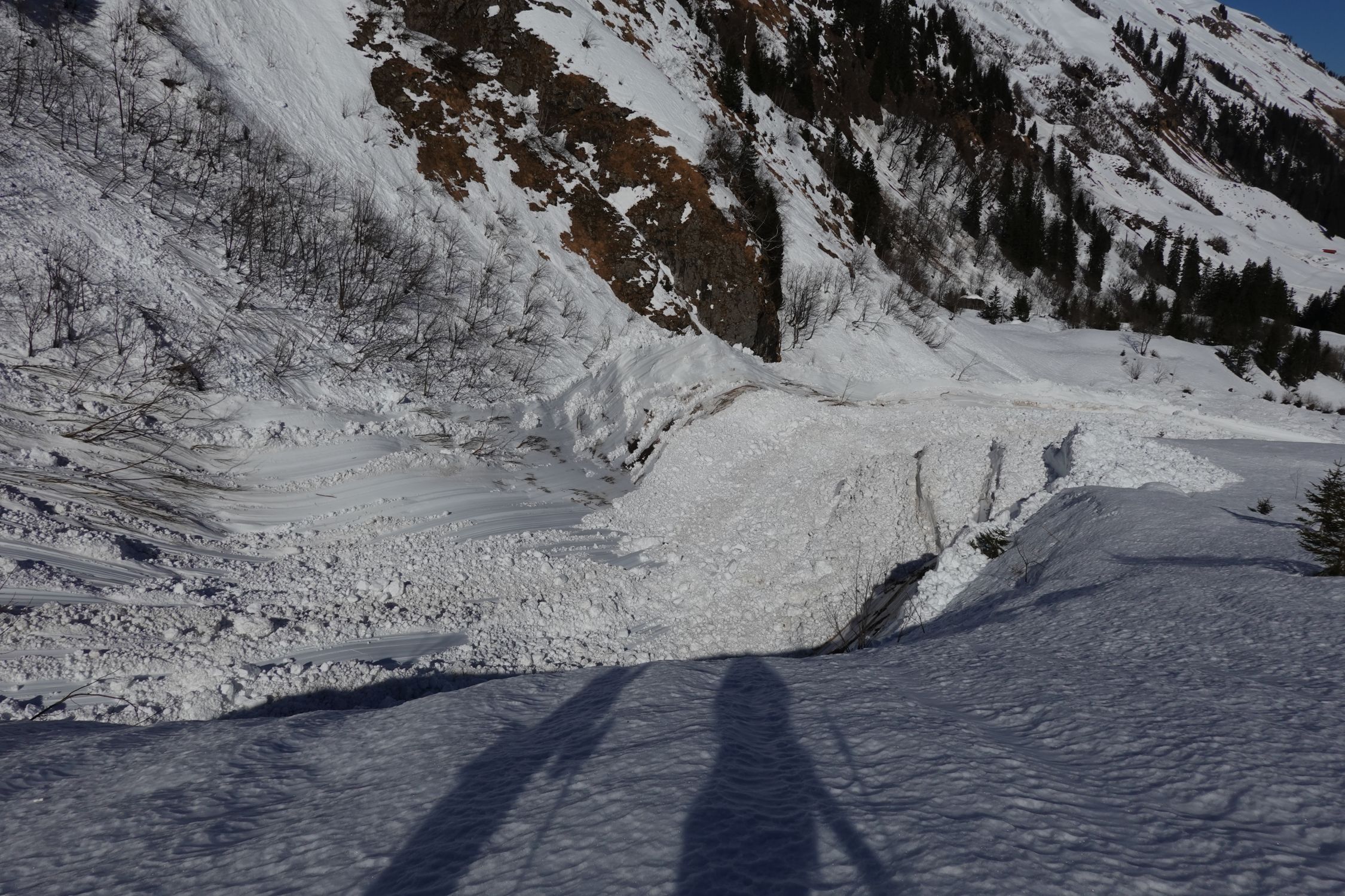 Trotzdem sind Touren in diesem Bereich bis auf weiteres NICHT zu empfehlen. Vermutlich am 23.2. 2026 als die Durchfeuchtung von oben das schwache Altschneefundament erreicht, löste sich unterm Wilden Grat und auch in der Gamswanne eine sehr große Lawine, die den gesamten Talschluss in ein Trümmerfeld verwandelt hat. Im Bereich zwischen Forstraßenende und Schönberger Hütte ist Ski fahren so gut wie nicht möglich. Teilweise sind die Gleitbahnen so hart, dass Steigeisen nötig sind.