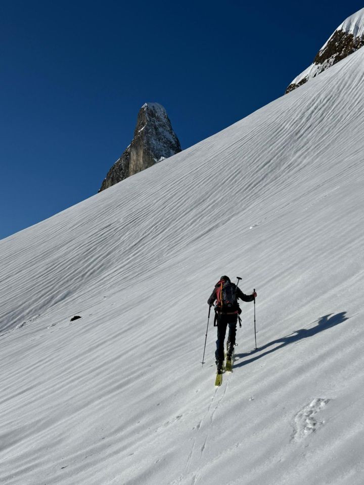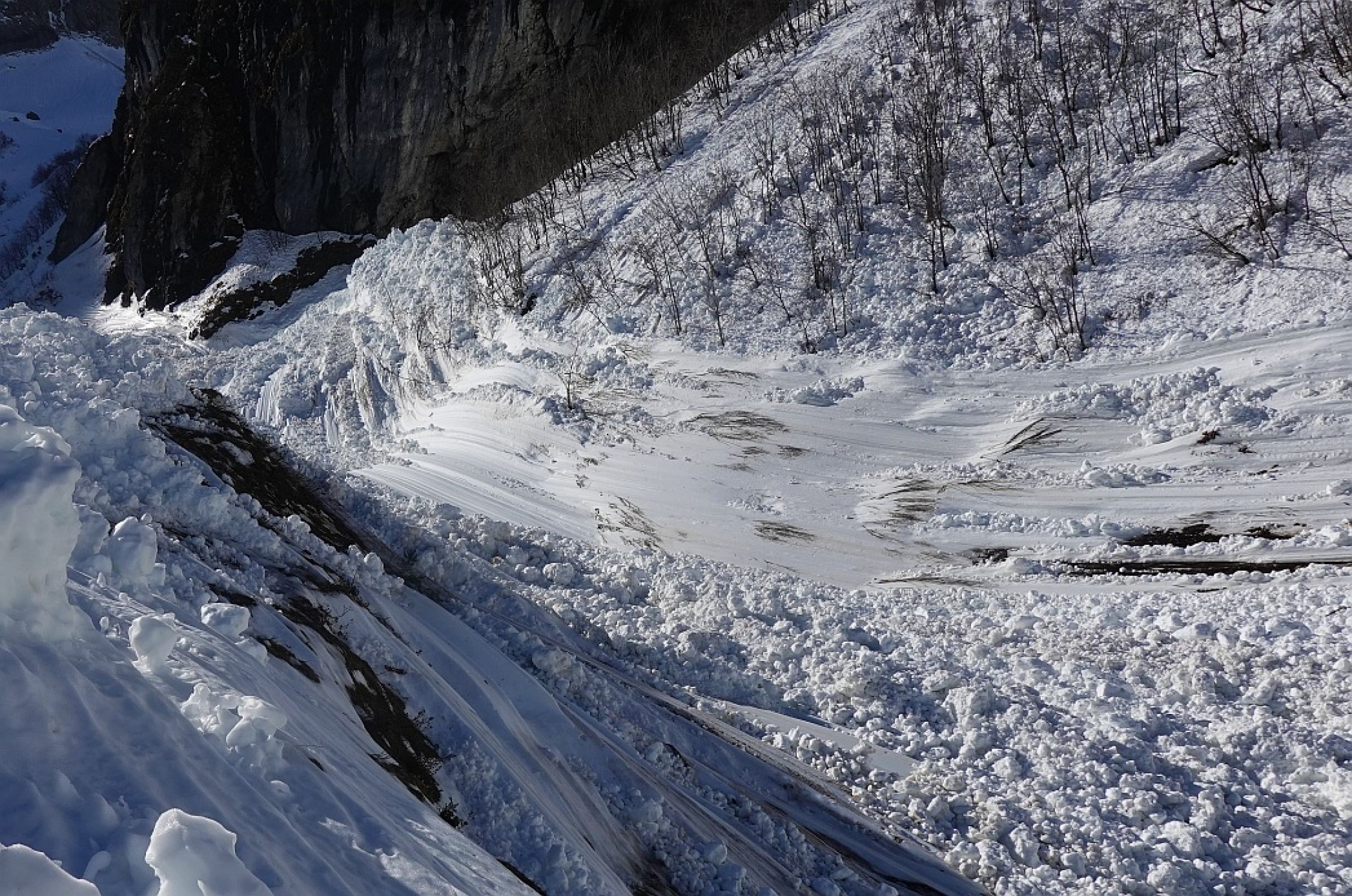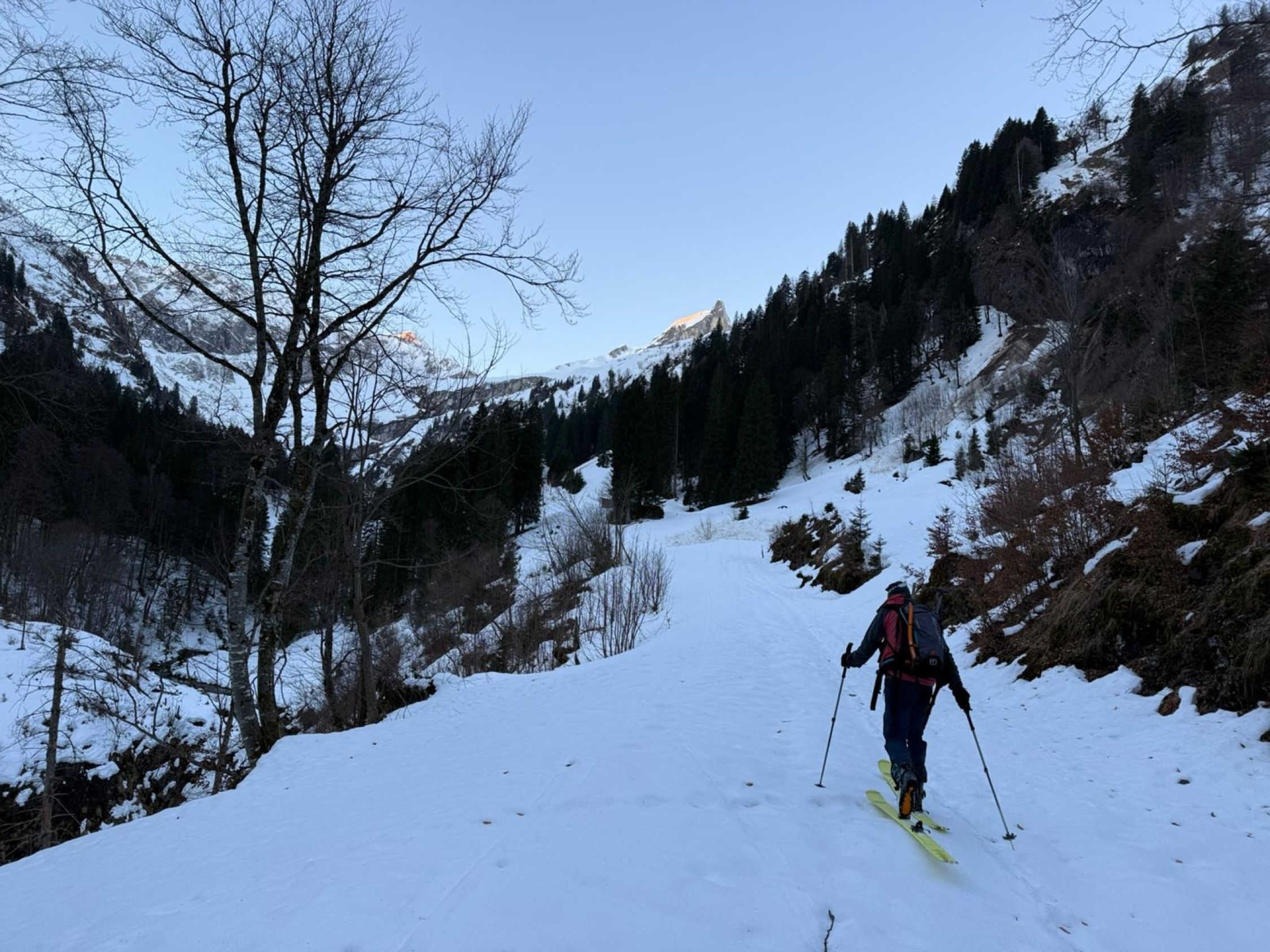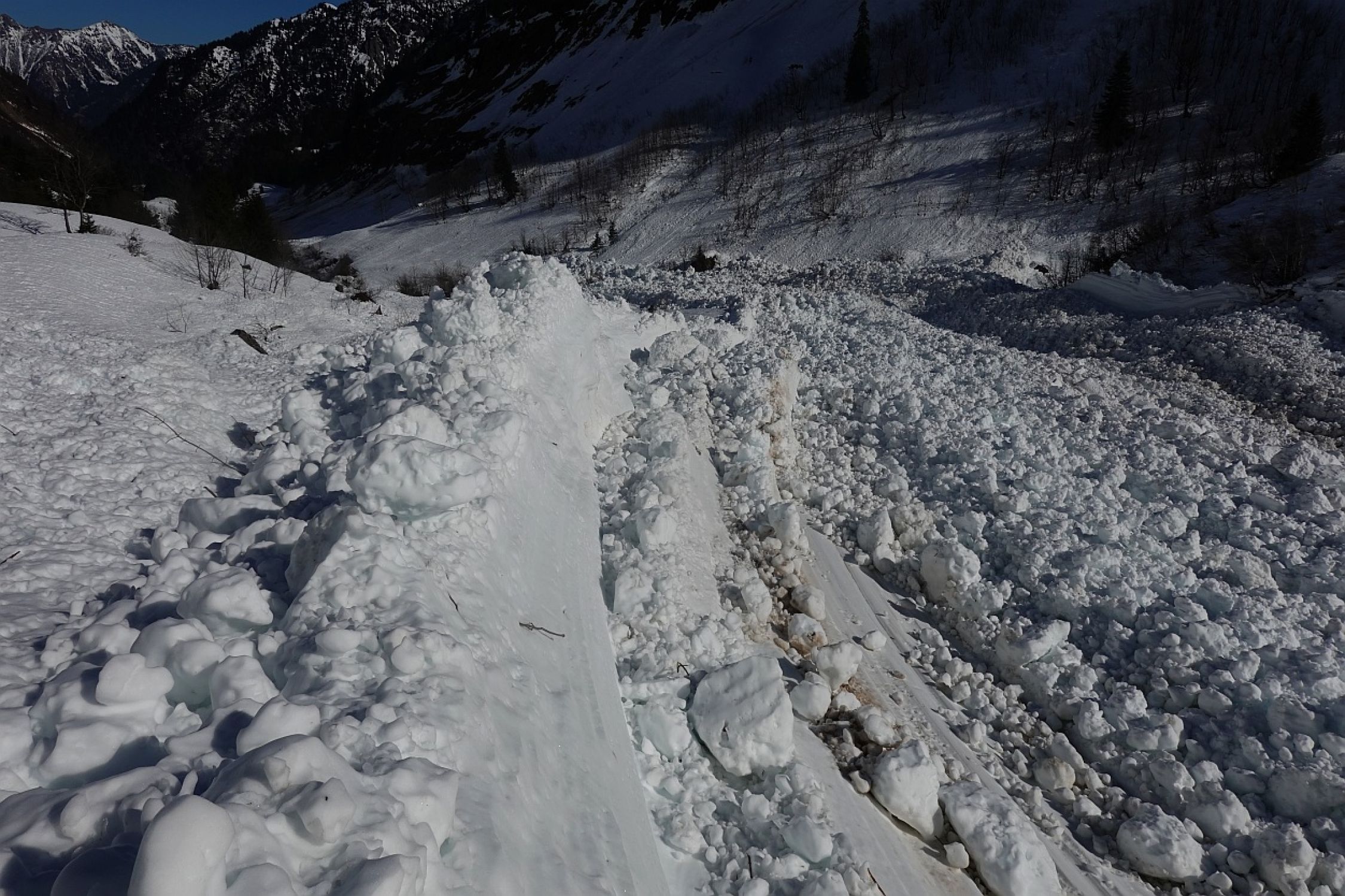 Trotzdem sind Touren in diesem Bereich bis auf weiteres NICHT zu empfehlen. Vermutlich am 23.2. 2026 als die Durchfeuchtung von oben das schwache Altschneefundament erreicht, löste sich unterm Wilden Grat und auch in der Gamswanne eine sehr große Lawine, die den gesamten Talschluss in ein Trümmerfeld verwandelt hat. Im Bereich zwischen Forstraßenende und Schönberger Hütte ist Ski fahren so gut wie nicht möglich. Teilweise sind die Gleitbahnen so hart, dass Steigeisen nötig sind.