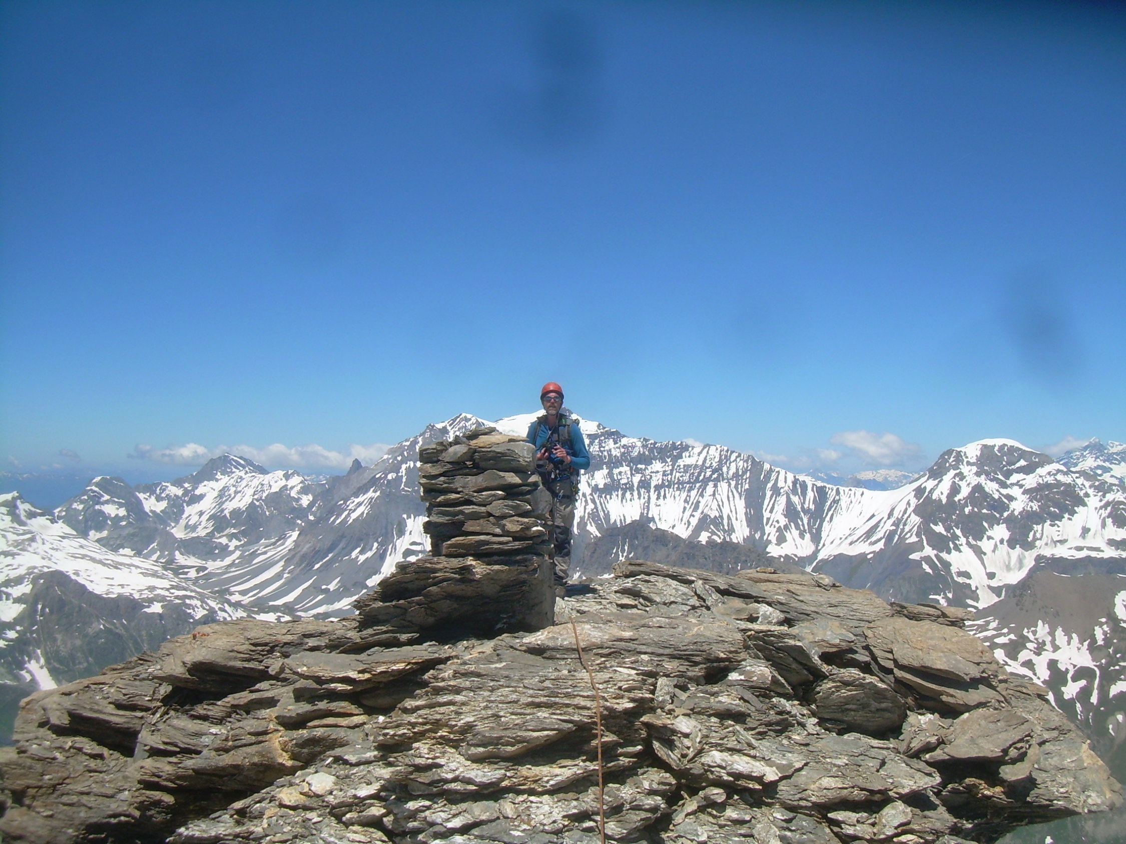 Die Aussicht blieb den ganzen Tag über glasklar. Neben Fernblicken vom Monterosa über Gran Paradiso und Montblanc im Norden, sowie dem Monviso im Süden, bot uns der Grand Roc Noir aufgrund seiner überaus güsntigen Stellung in der Arena der hohen Vanoisegipfel Ausblicke auf alle von uns in inzwischen vier Hochtourenwochen im Gebiet bestiegenen Gipfel. Ein prächtige Abschluß der diesjährigen Tourenwoche und zugleich eine vorläufige Verabschiedung von dieser wunderschönen Bergregion.