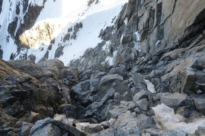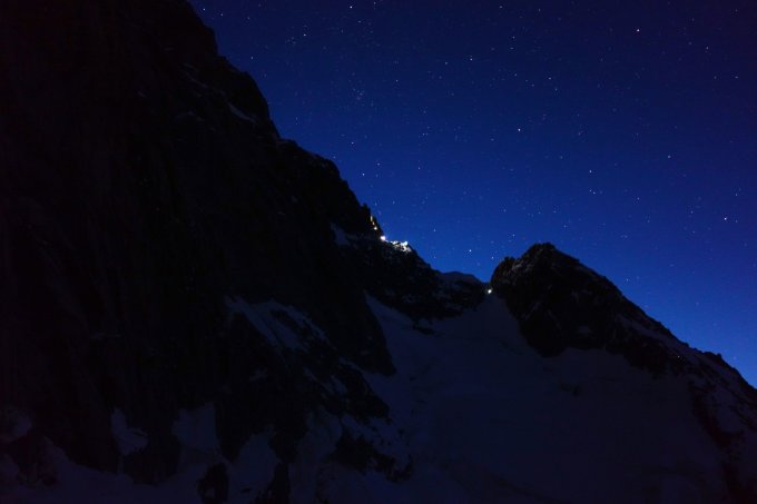 Start um 0:40h an der Monzinohütte. Zustieg zum Eccles in hervorragender Spur, Ecclesbivac um 3:40h erreicht. Ohne Probleme zum Col Emile Rey (keine Spur, vollständig im harten Firn), Einstieg in die Wand um 5:10h. Null Steinschlag und gut zusammengefrorener Fels in der Wand. Rinne mit dünnen freihängenden Eiszapfen vereist, wir sind über die Schuppe nach rechts gequert. Fingerriss geklettert, dann seilfrei in grobkörnigem, sonnengereiften Firn fast ohne Felskontakt zum Gipfel der Amédée, 9:45h. Pause bis 10:30h. Zunächst noch ganz gut voran gekommen am meist schneebedeckten Grat, südseitig weicher, zunehmend etwas fauler Schnee, nordseitig mit Kruste gedeckelter Pulver. Felsen gut mit Eis zusammengefroren. Den relativ einfachen Firngrat haben wir gespurt, jedoch aufgrund Höhe und Müdigkeit nahezu vollständig durchgesichert; das hat gedauert! (17:00 am Courmayeur, 17:30h alleine am Hauptgipfel, 20:00 am Rif. Gouter).