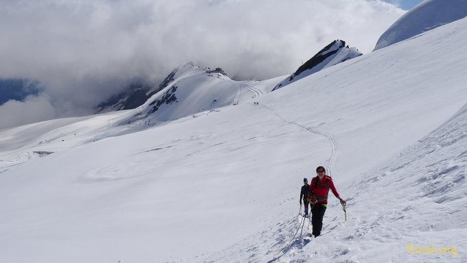 Die Spur ist gut angelegt. Spalten waren keine sichtbar. Im unteren Teil liegt noch recht viel Schnee, ab 3'800m an windexponierten Stellen hart aber griffig.