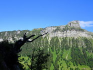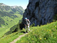 Beatenberg 1121 m. - Grön 1123 m. - Pufel 1254 m. -Niederhorn 1963 m. Von der Bahnstation in Beatenberg der Strasse folgen die zur Alp Grön ins Justistal führt. Hier das Tal hinauf Richtung Sichle bis zum Brätliplatz beim Pufel 1254 m. Die Brücke überqueren und, nach ca 80 m. bei einem Stein nach rechts zum Waldrand, wo der "verunstaltete" Wegweiser sichtbar wird. Nun dem Bergweg folgen der über Steilhänge, Geröllhalde, steile Rippen mit Leitern ,zum Ausstieg beim Weg Niederhorn-Burgfeldstand- Waldegg führt. Hier kann man zur Niederhornbahn oder weiter bis zum Gemmenalphorn, Grüenenbergpass oder Habkern gehen.