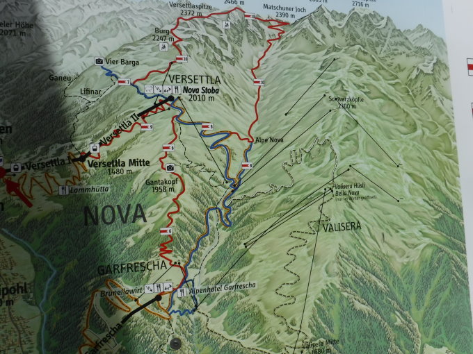 Tourenbeginn um 12:00 Uhr bei 19°C und heiterem Himmel. Berg- u. Talfahrt mit der Versettla-Bahn. Tour verlängert über den flachen Kammweg zur Versettla und zum Gipfelkreuz der Madrisella.
