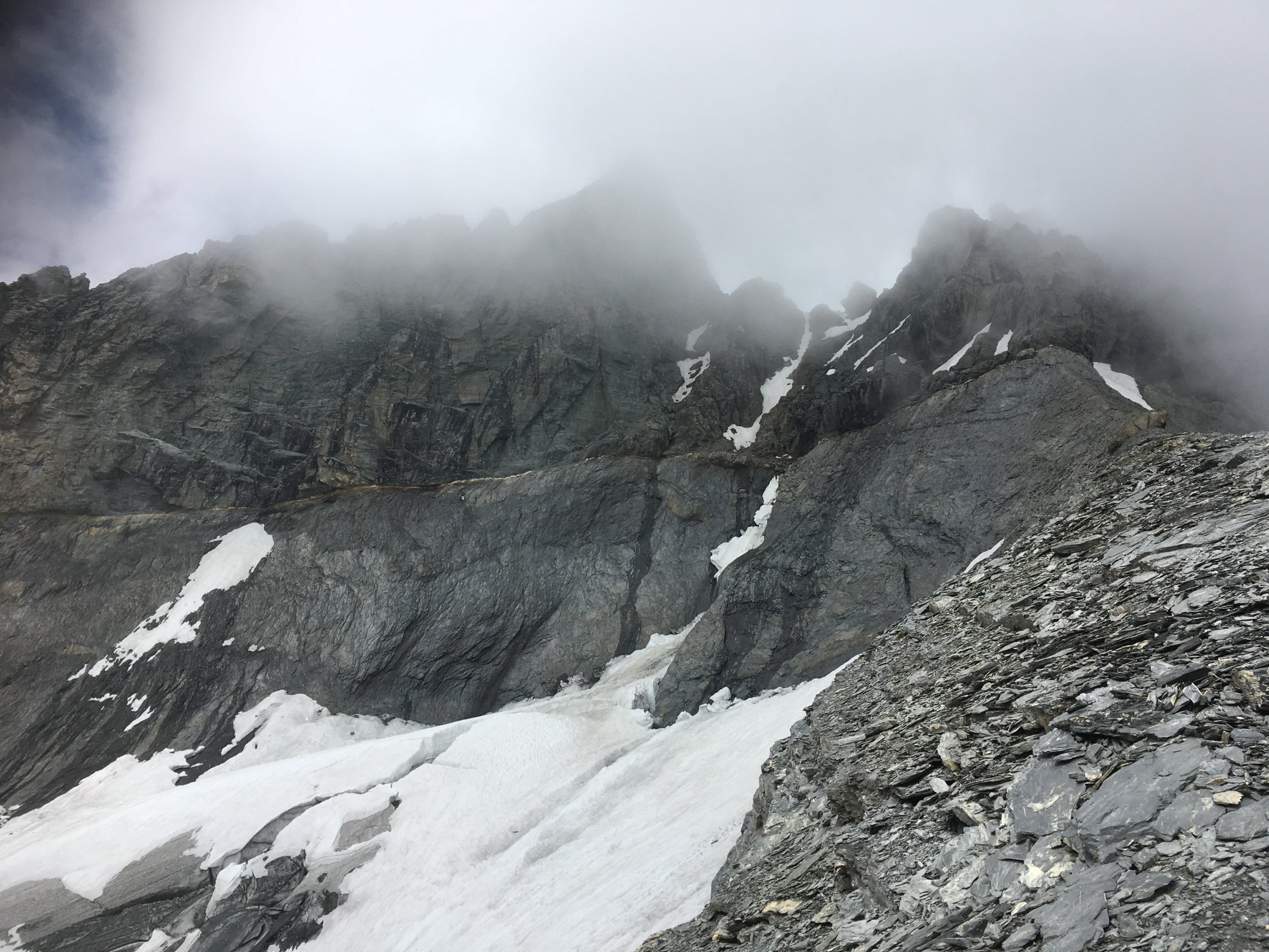 Insgesamt noch recht viele Altschneefelder, der Gletscher gut begehbar, wenngleich im Aufstieg mühsam. Für direkt Einstieg - vom Gletscher senkrecht hoch zum Beginn des Klettergrats - Steigeisen definitiv empfehlenswert.