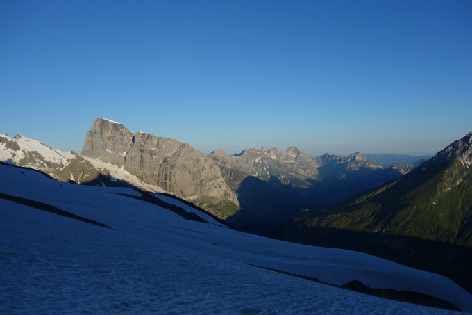 Trotz ein paar Schneefeldern erreicht man die Schlossberglücke problemlos ohne Steigeisen. Der Abstieg von der Lücke zum Gletscher erfordert etwa Fantasie (grosse Wechte), geht aber gut. Der Gletscher ist sehr gut mit Schnee bedeckt, ist aber durch die Sonne und den Regen sehr "verlöchert". Dies macht die Fortbewegung aufwändig. Die Schneezunge vom Spannortjoch erstreckt sich noch bis zum 2. Stand, ist aber in der Mitte schmal und etwas steil - wir haben die Steigeisen und Pickel benutzt. Das obere Schneefeld vor dem Gipfel kann noch nicht umgangen werden - wir waren froh, den Pickel dabei zu haben. Sonst ist der Aufstieg vom Joch zum Gipfel schneefrei und trocken.
