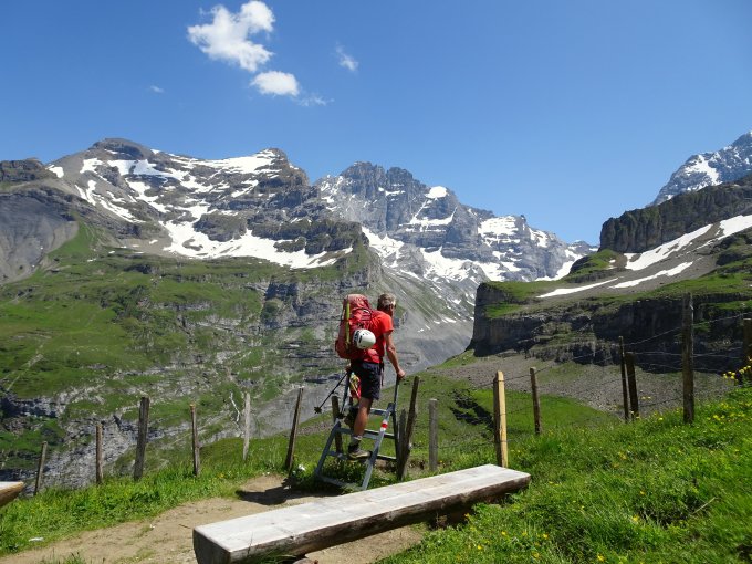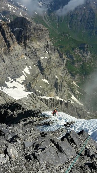Wetter warm und sonnig, ab Mittag Quellwolken, aber bis nachmittags trocken. Außer uns nur noch eine andere Seilschaft am Berg. Mit Hüttenzustieg über die Bundalp und Abstieg über Gamchi ergab sich eine schöne Rundtour.