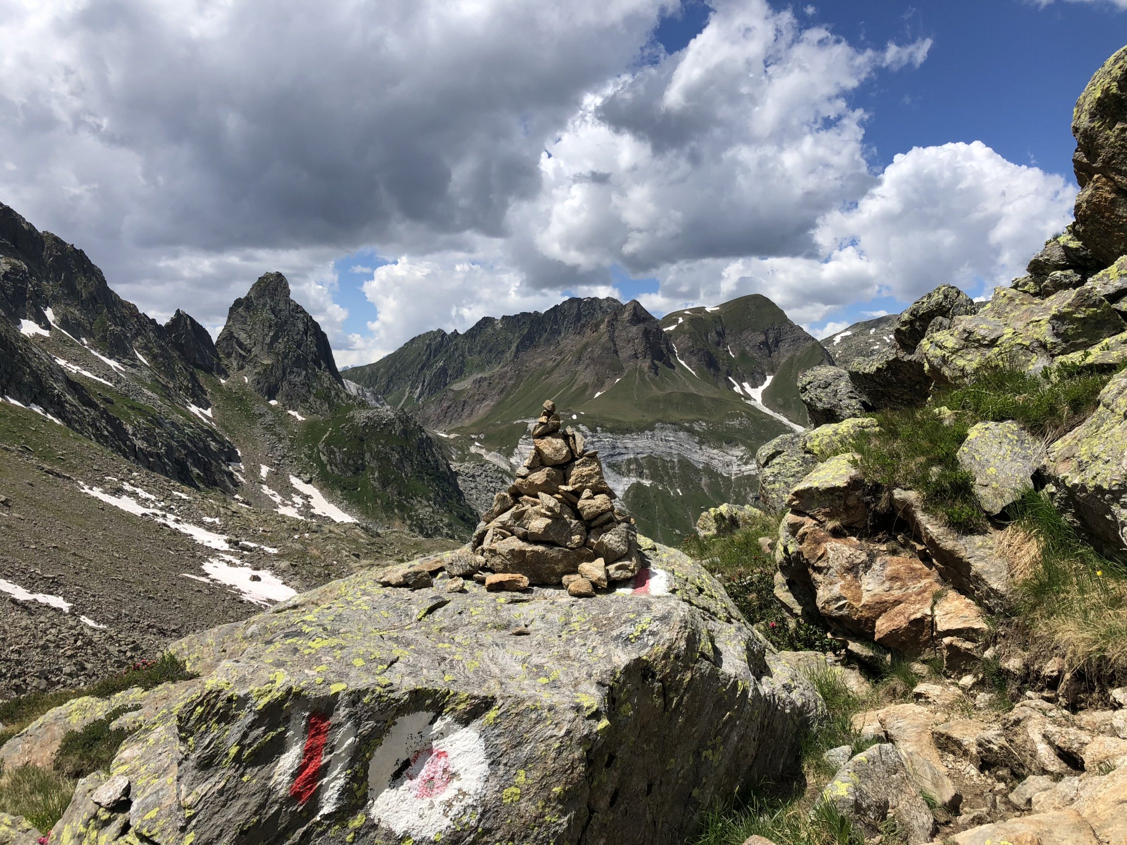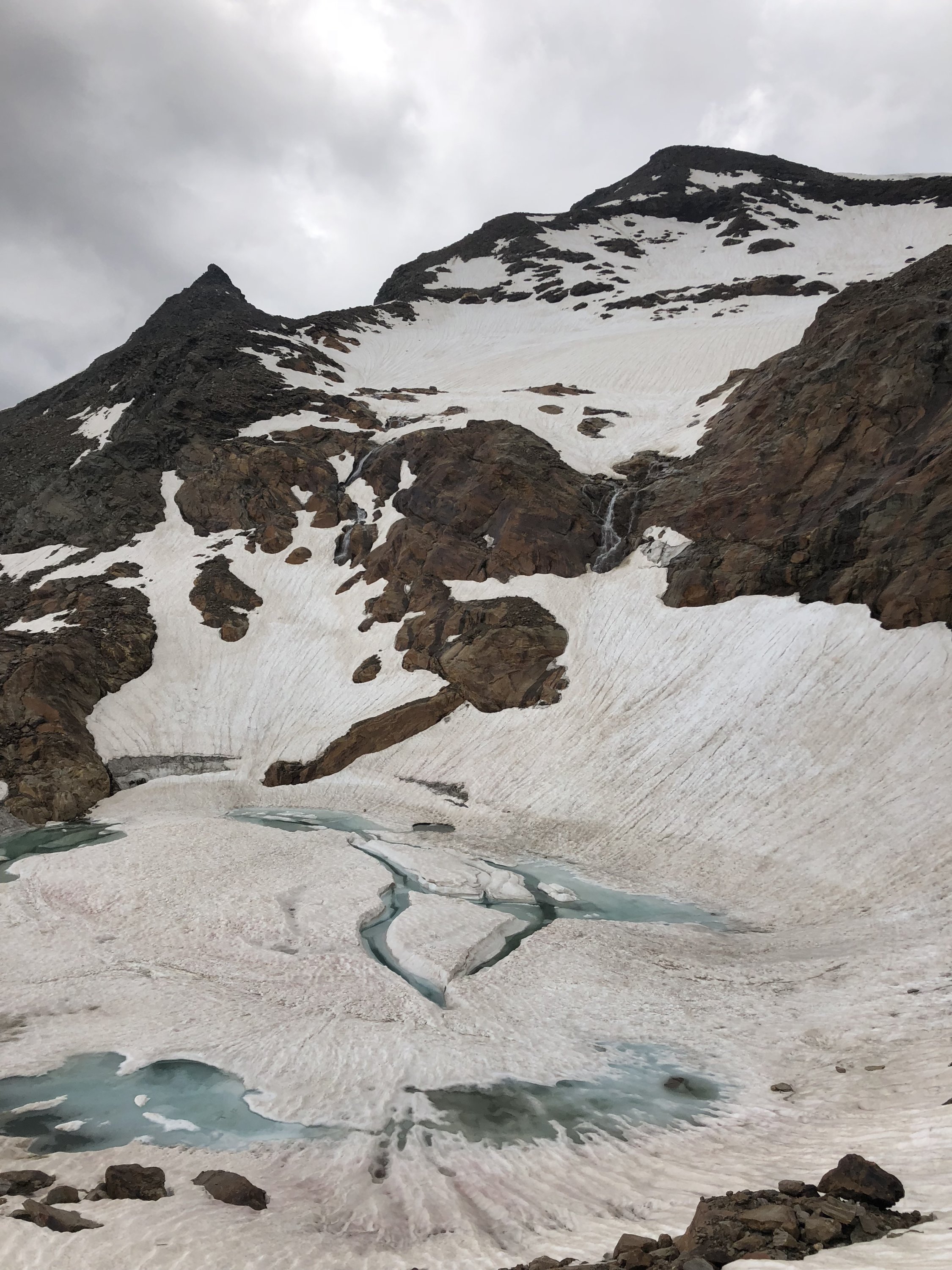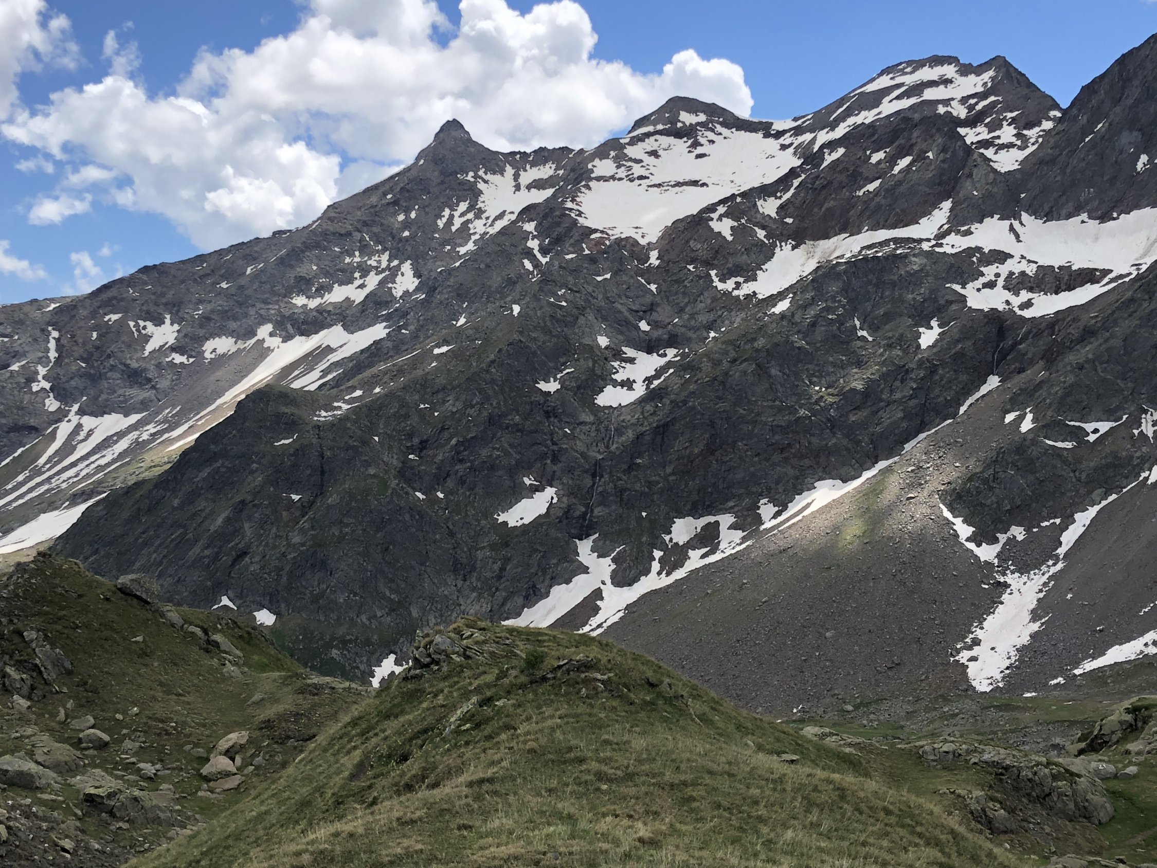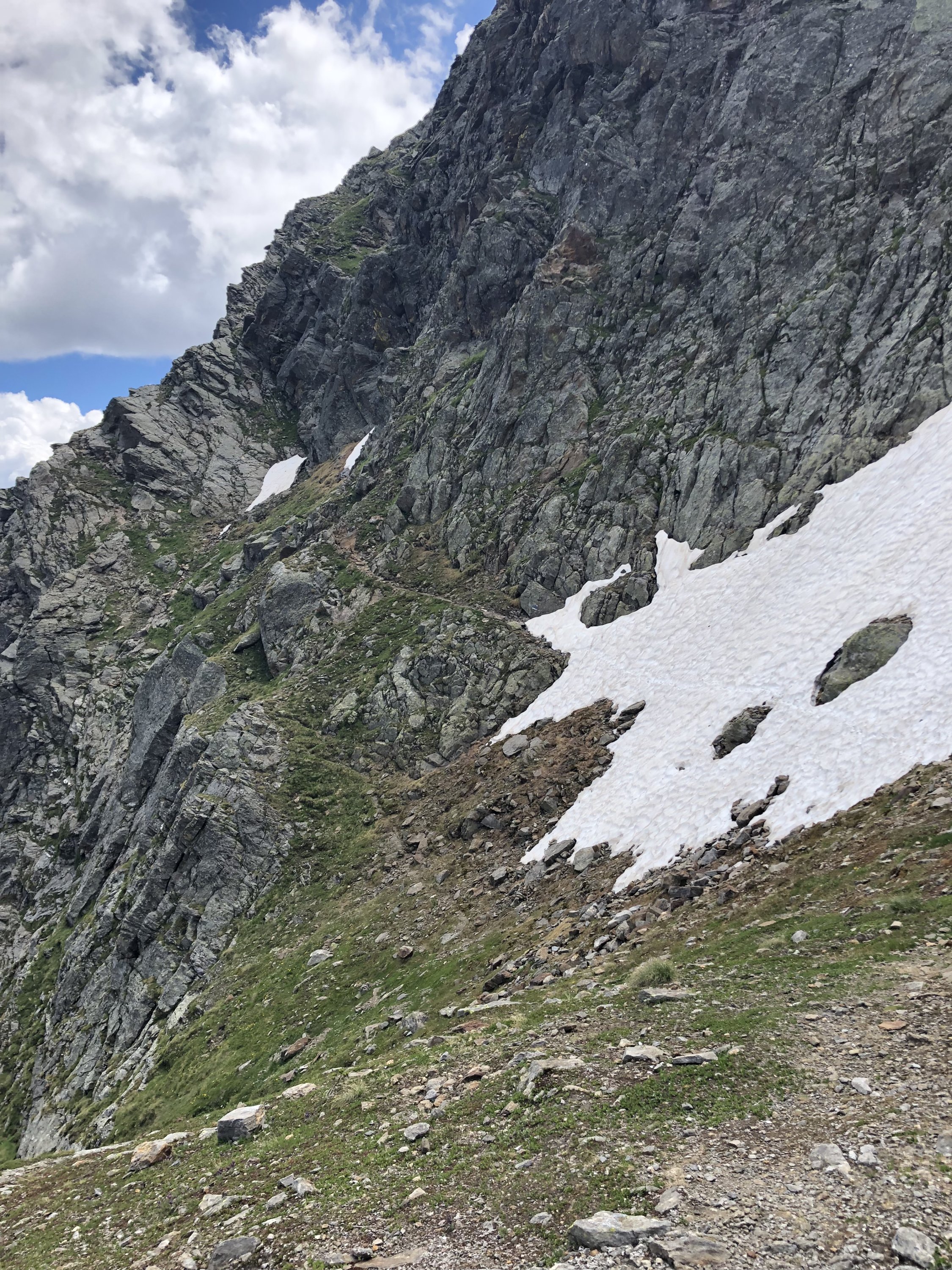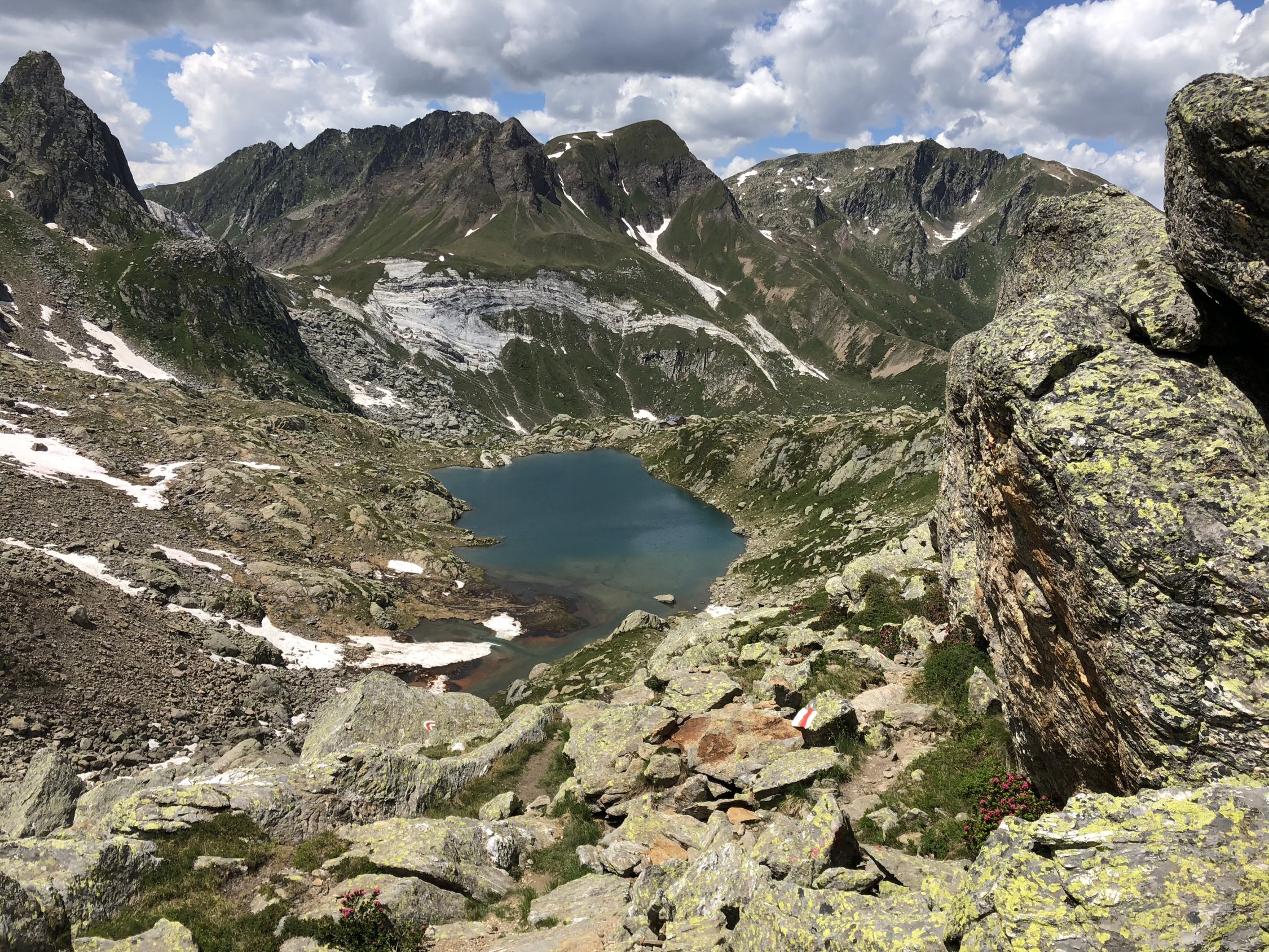 Wunderbare Verhältnisse, morgens um 8 Uhr noch nicht zu warm. Die Schneefelder nach der Hütte waren ideal angetaut, so dass man sie bequem mit meinen eher weichen Schuhen queren konnte. So stellen die Schneefelder im Aufstieg kein Hindernis dar. Im Abstieg konnte man sie meistens abrutschen. Weg ist immer sehr gut markiert.
