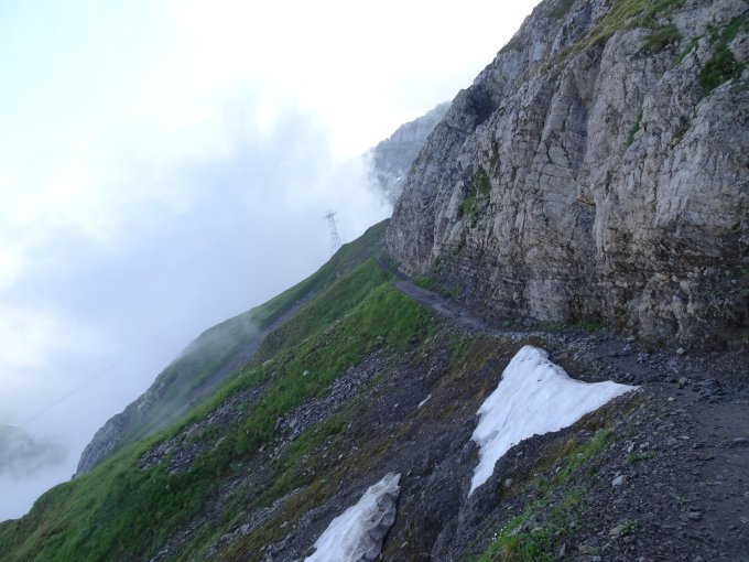 Unter der Langwand ein Mini-Schneefeld von wenigen Metern; ansonsten kommt man schneefrei bis zum Gasthaus. Erster Schneekontakt dann ca. 80 Höhenmeter unterhalb der Stütze II. Weg von der Stütze bis zum Gipfel wieder schneefrei; oder man geht auf dem Schneefeld weiter um weiter oben über Geröll auf den Weg zu gelangen.