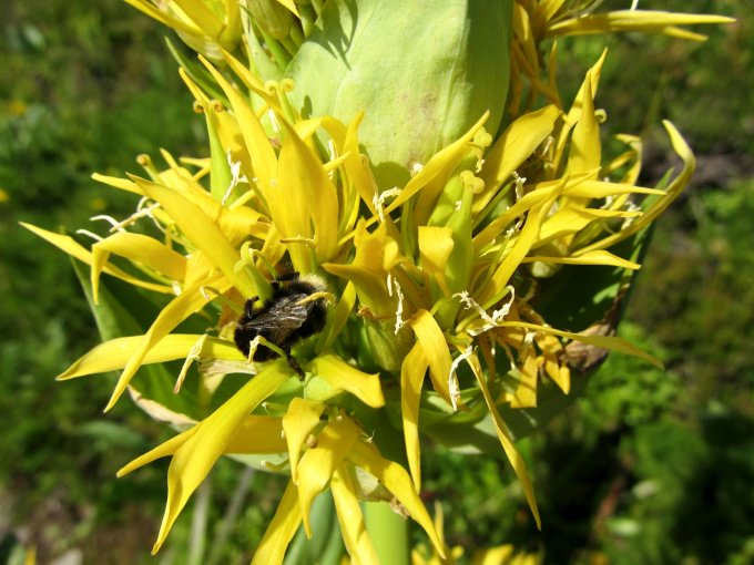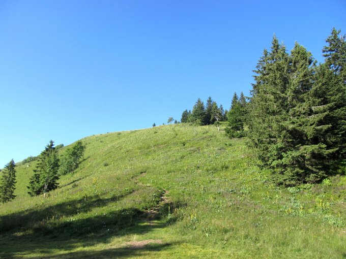 Ein strahlend schöner Morgen. Start bei 12 Grad. Im Schatten der Flanke und des Waldes stieg ich bergan. Im offenen Gelände oberhalb der Waldgrenze eine immense Blumenpracht mit unzähligen Gelben Enzianen und Arnika.