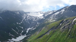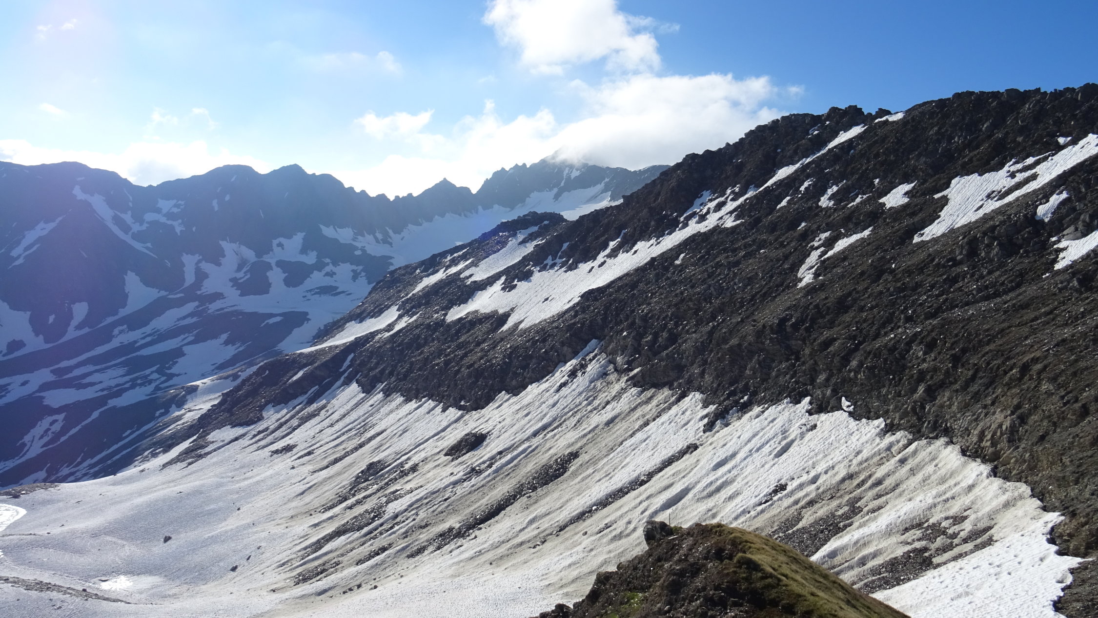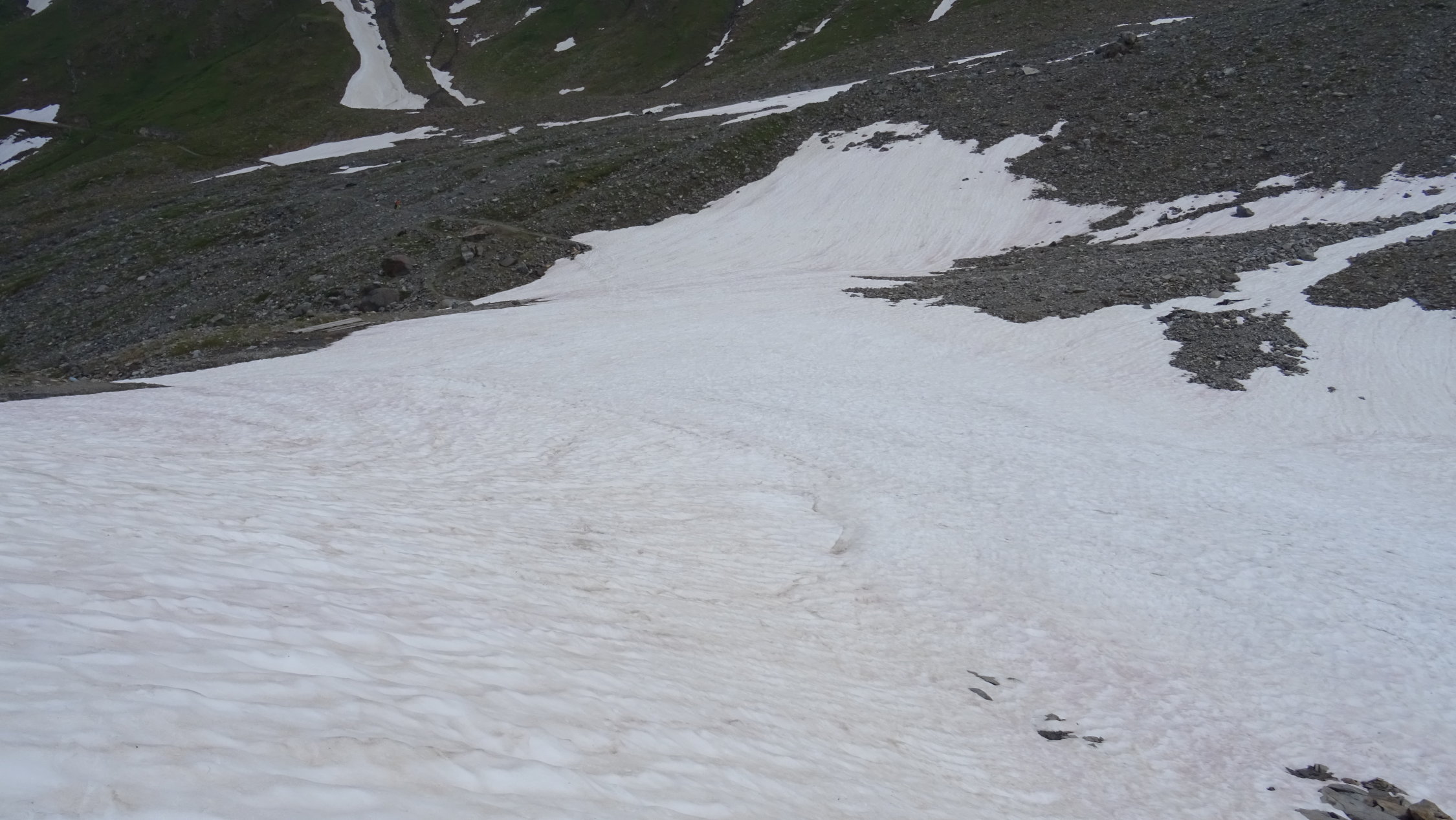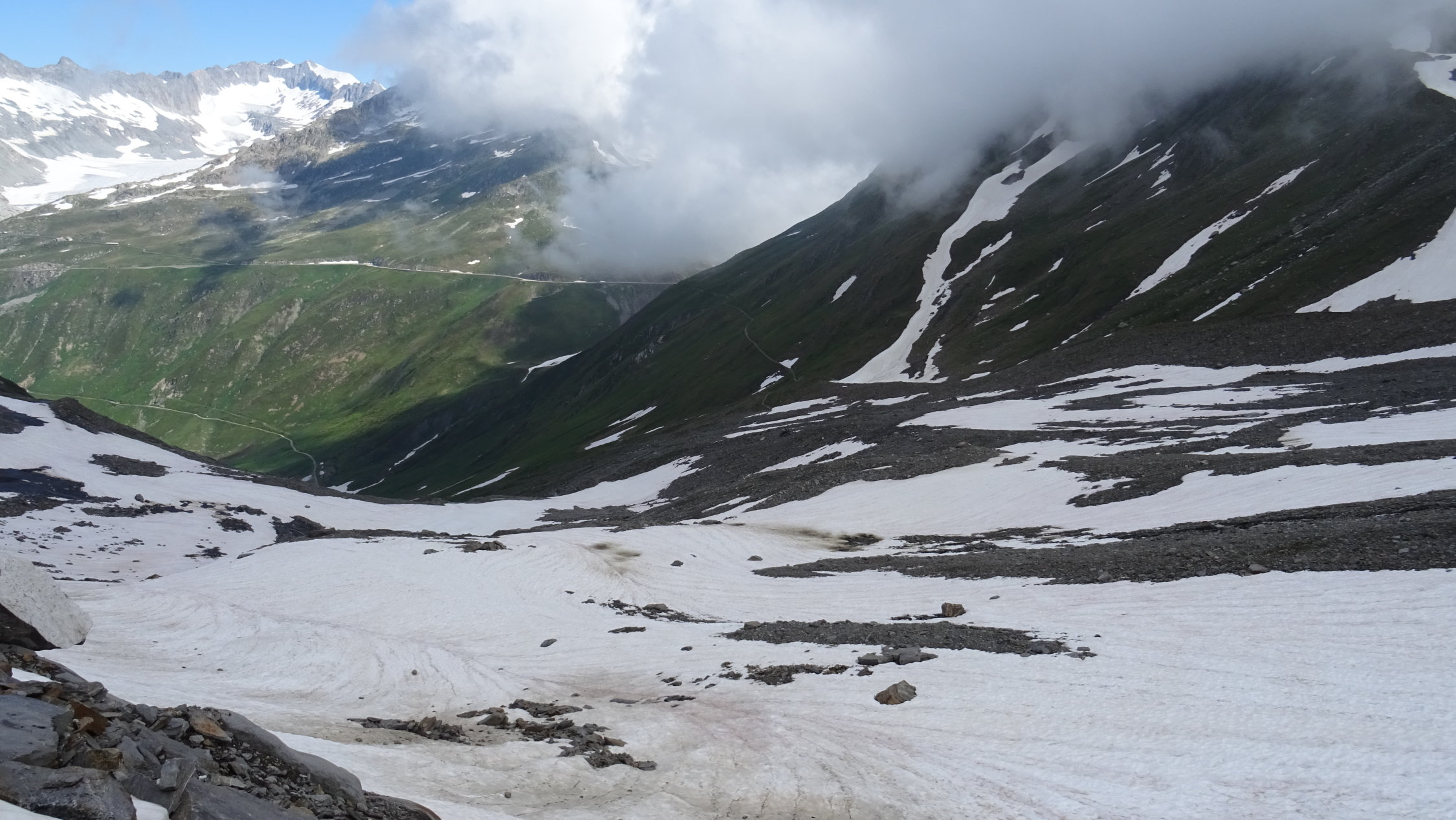 Vom Furkapass bin ich mit dem Velo die 2 km der Militärstrasse nach bis zum Schnee gefahren.