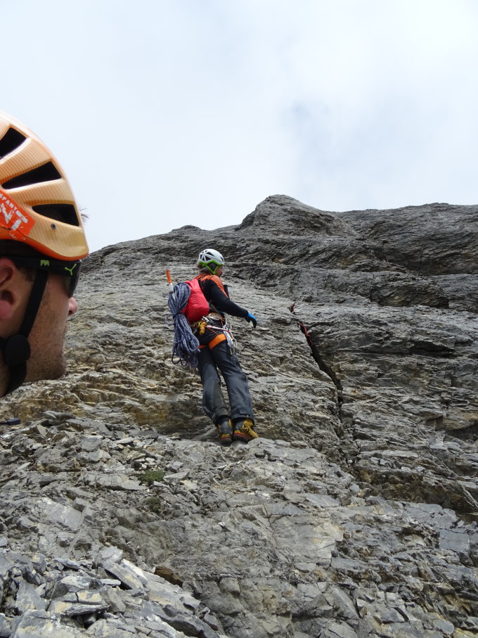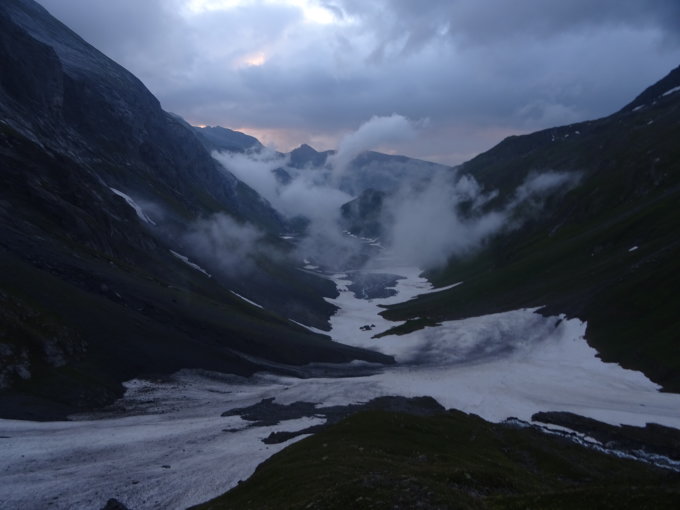 Die Nebelschwaden und die fehlende Sicht machten es uns in den ersten 7h nicht gerade einfach. Trotz eins, zwei Verhauer, ging der Zeitplan fast auf.(+1h.) In Briegels die Alpstrasse verfehlt, am Frisal in der Westseite beim Aufstieg auf den Grat in die linke, statt rechte Rinne gestiegen, was ein anspruchsvollles abklettern zur Folge hatte, den Abstiegversuch über den Nordgrat in die Barcun Frisal Sura rechtzeitig als für uns unmöglich erkannt zu haben und die Nordostwand über die Schneegefüllte Rinne auf den Gletscher verlassen können. Merci Vali, für dä spannendi Tag!!!