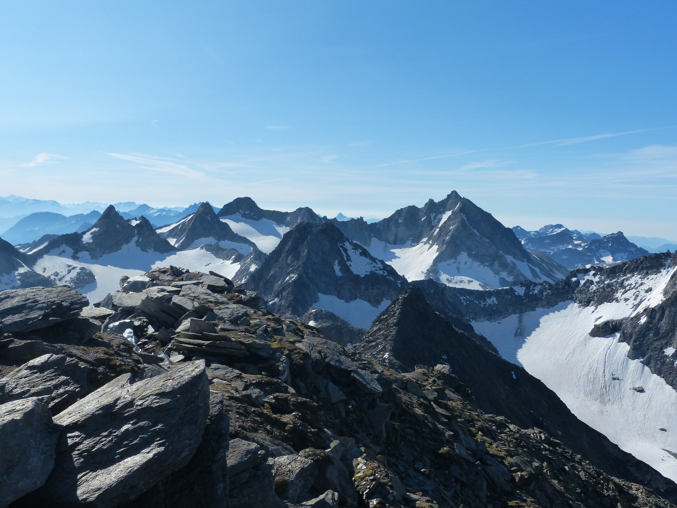 Herrliche Gipfelrast Windstill - heute auch gute Sicht zu Mont Blanc und einigen Wallissern. Auch das Rotondo Gebiet zeigt sich hier von der besten Seite. Erste gemeinsame Tour mit Schneeracer.