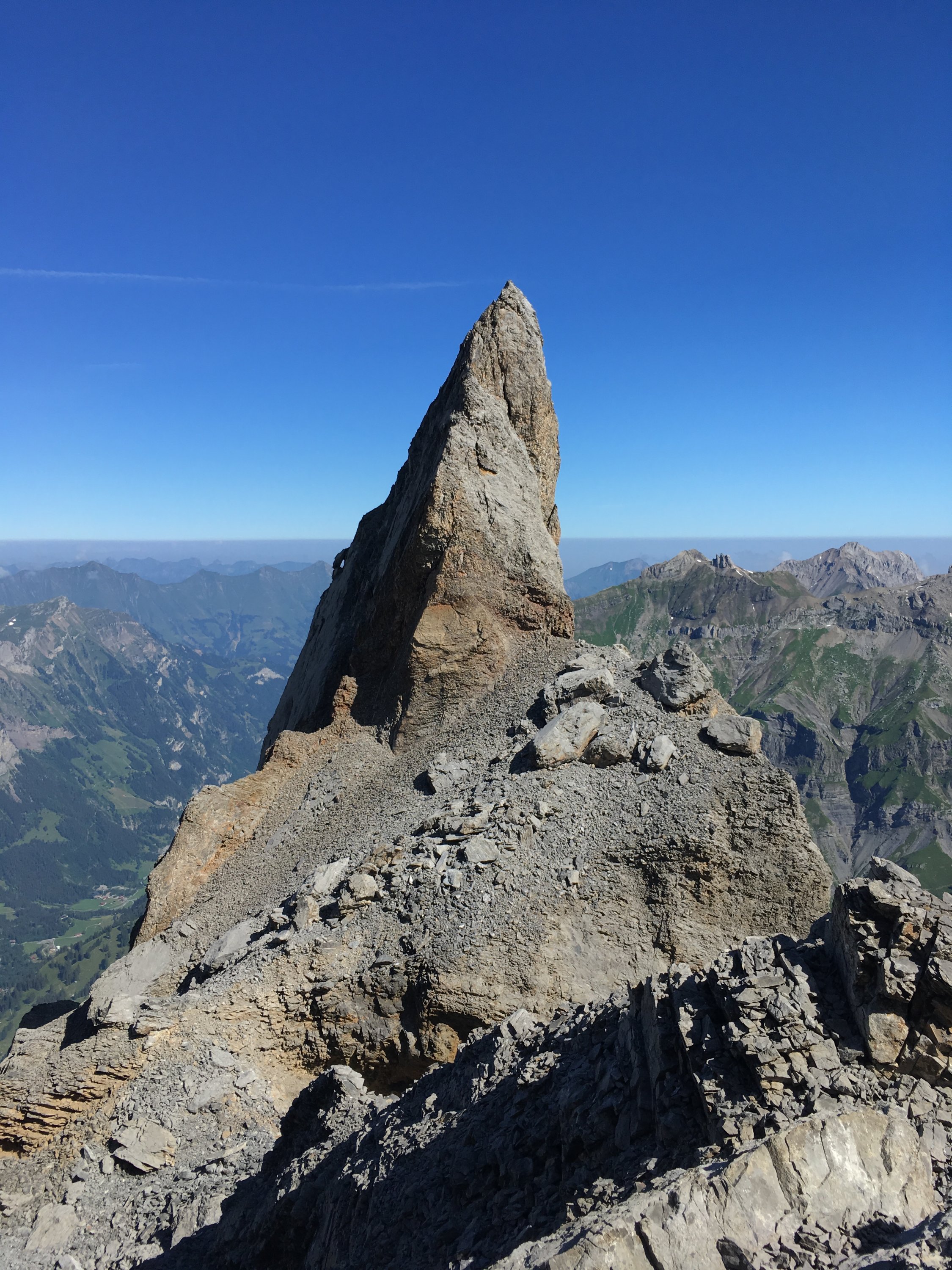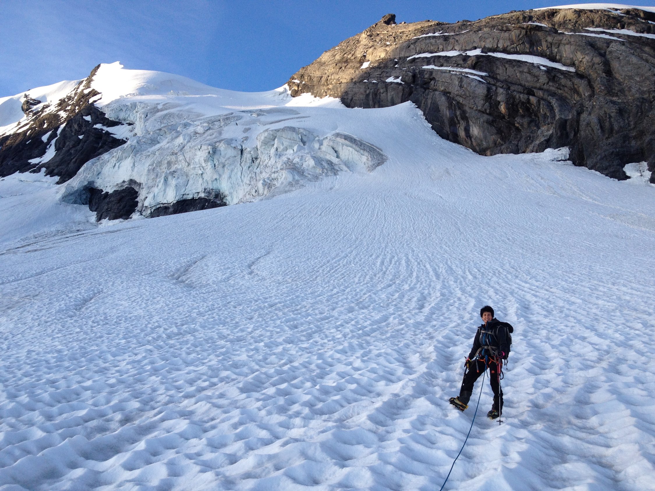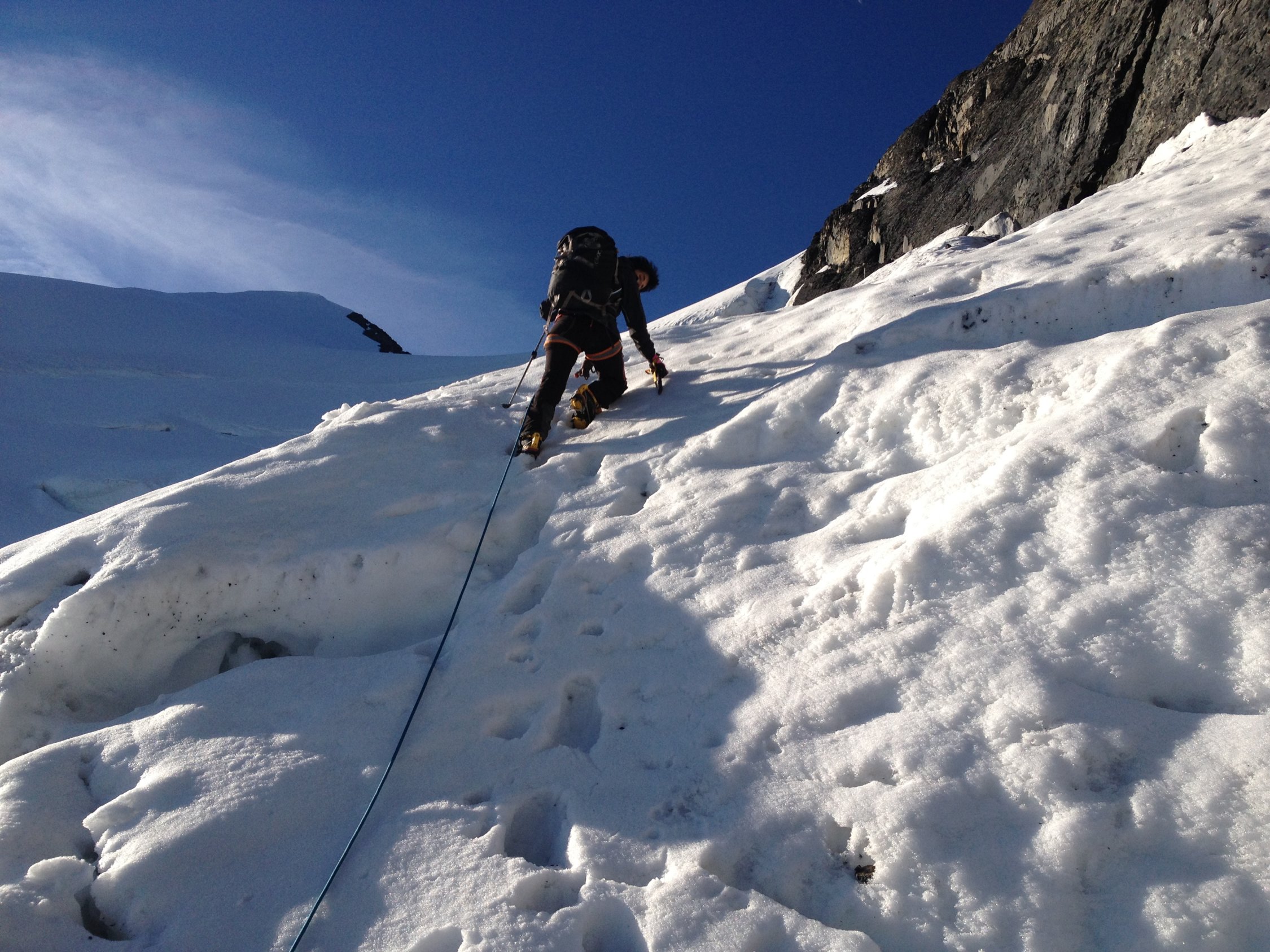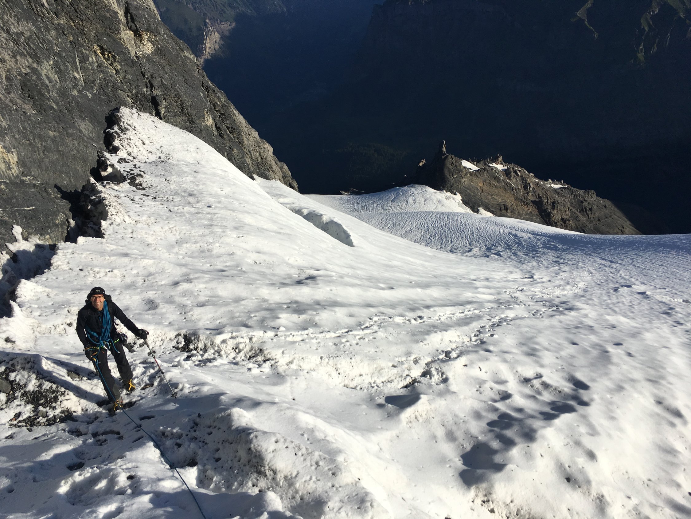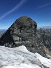 Weg zum Spitzen Stei gut markiert. Übergang zum Gletscher unproblematisch. Gletscher gut eingeschneit. Spur führt über die beiden grossen Querspalten (harter Firn) in die Nähe des Sattels (3432m) und in direkter Linie zum Gipfel. Gipfel um 8 Uhr erreicht.