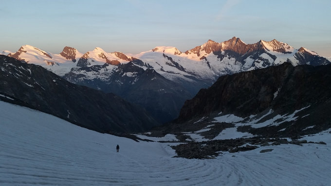 Top Wetterbedingungen, warm bis auf 4000 m, erst auf dem Gipfel kühler Wind. Noch immer Schneefelder (hart gefroren am frühen Morgen) unterhalb Zwischenbergenpass. Aufstieg über SE-Flanke über harten Firn (mit Steigeisen). Grat war mehrheitlich schneefrei; wenige kurze Abschnitte mit (hartem) Trittschnee konnten über Fels umgangen werden. Gletscherbruch war gut gespurt mit reichlich weichem Trittschnee im unteren Teil.