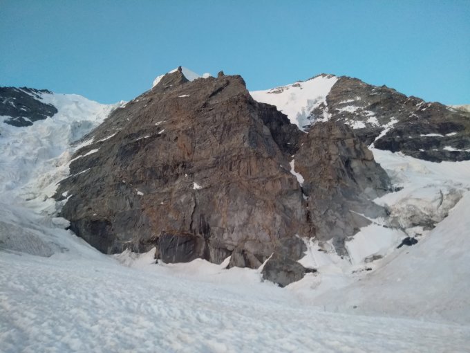 Die Direkteinstiege im Fels sehen de visu nach unerquicklichem Gelände aus (brüchig und schuttig). Wir hatten den Eindruck, als ob etwas links noch eine Schneezunge ist, wo der Übergang vom Gletscher auf den Fels möglich ist. Gerade hinauf in den Fels ist die Randkluft unüberwindbar.