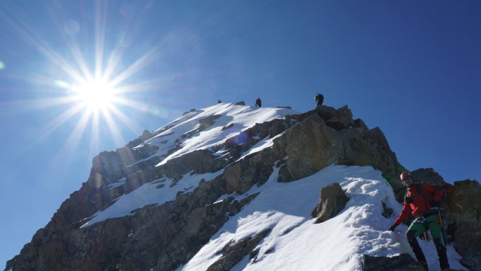 Insgesamt noch recht viel Schnee mit idealen griffigen Verhältnissen. Auch das Zustiegscouloir zum Grat hat noch ausreichend Schnee. Mehrere Abschnitte im Grat bieten momentan anstatt Fels längere steile Firnpassagen. Die Schlüsselstelle ("Bronzepferd") kann z.Zt. noch im Firn und mit leichter Kletterei links in Aufstiegsrichtung umgangen werden. Früher Aufbruch empfehlenswert. 4:15 Uhr an der Hütte gestartet, 08:30 Uhr Gipfel war ideal.