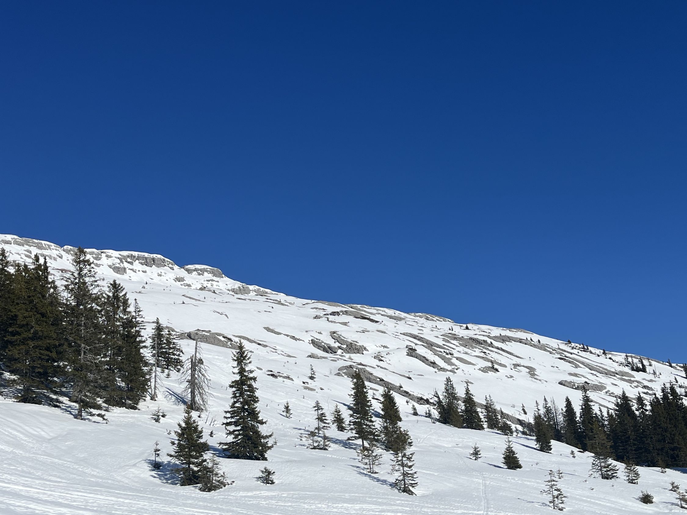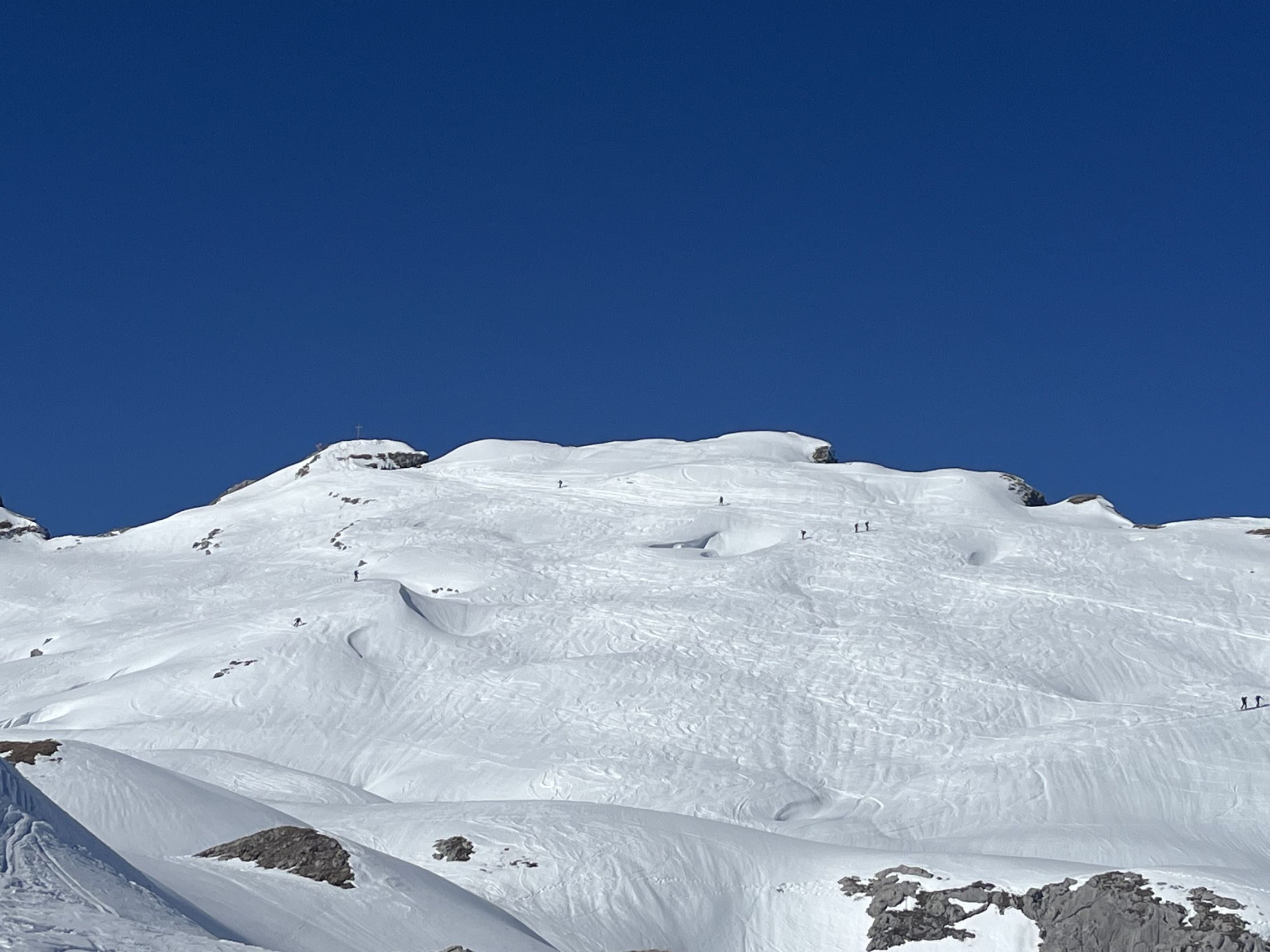 Das schöne und warme Wetter der letzten Tage hatte viel Volk in die Berge gelockt. Von unverspurten Pulverschneehängen war nichts zu sehen, Wer Firstlines fahren will, muss auf neuen Schnee hoffen oder die nächste Saison abwarten.
